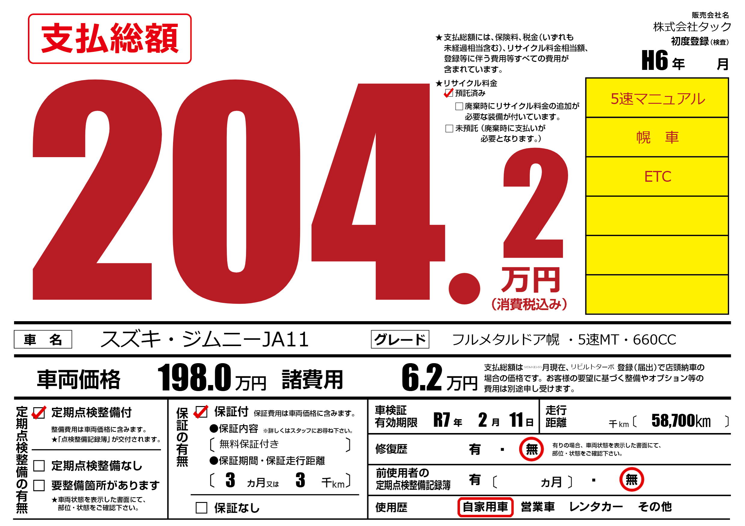 | 車検制限 | R7年 2月 11日 | ||