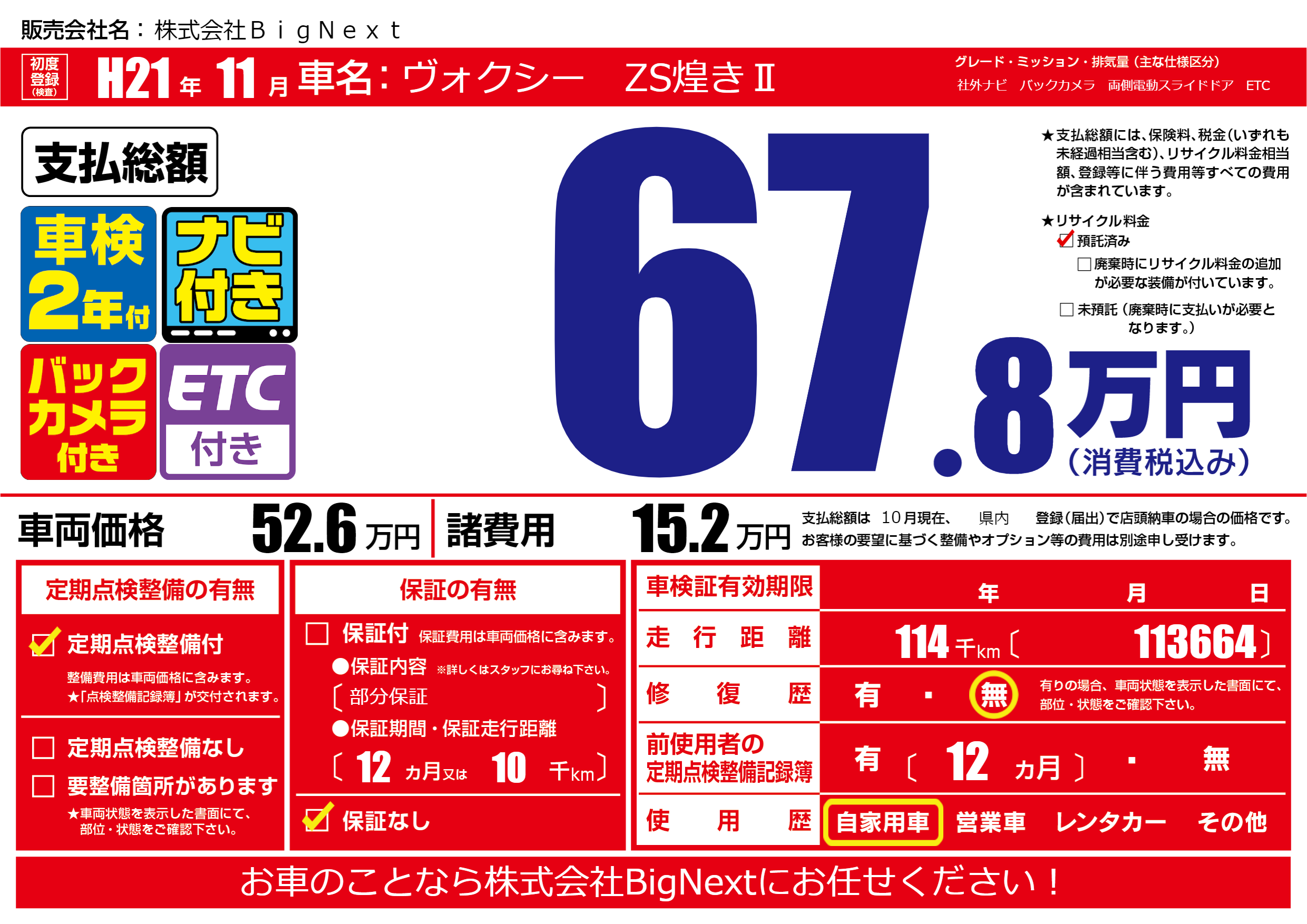 | 走行キロ | 11.4万km | 初年度登録 | H21年11月 |