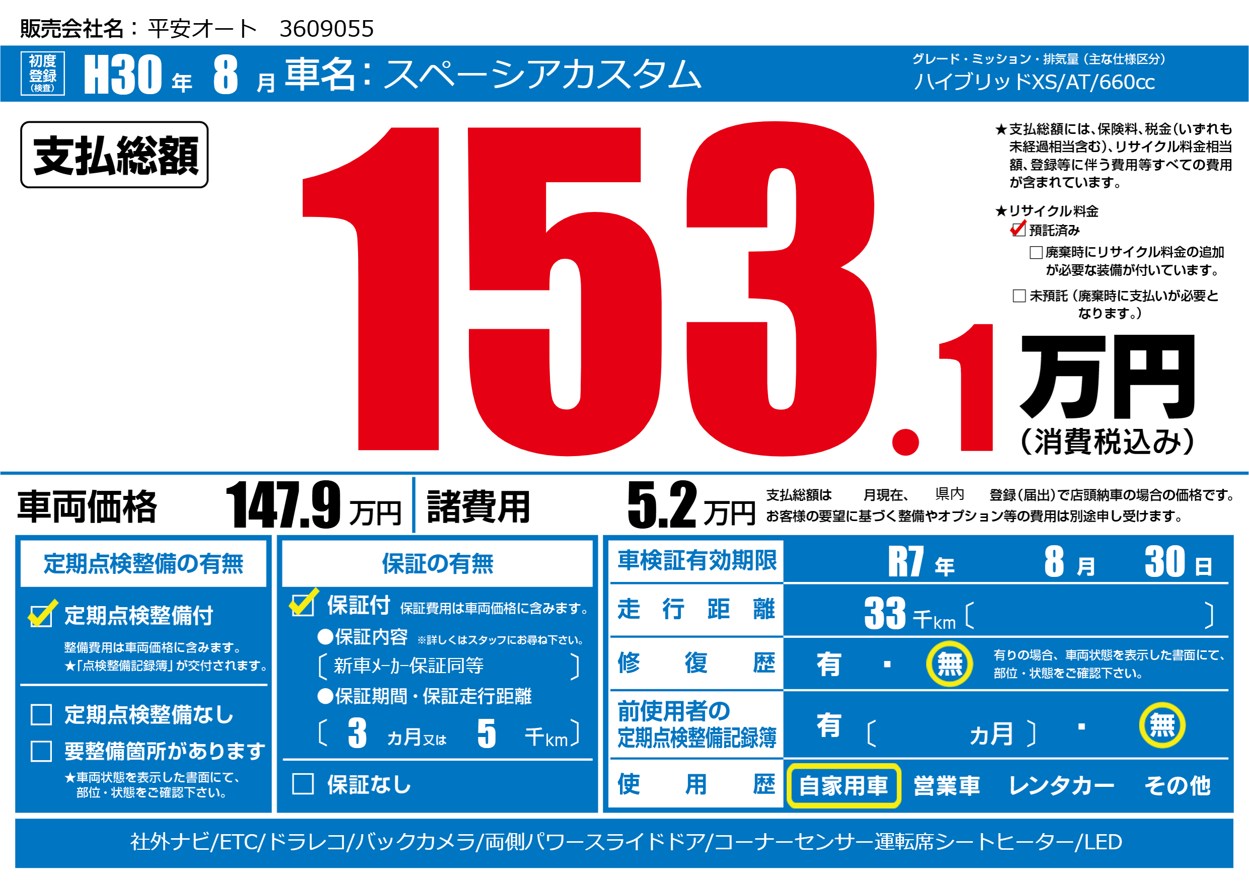 | 走行キロ | 3.3万km | 初年度登録 | H30年8月 |