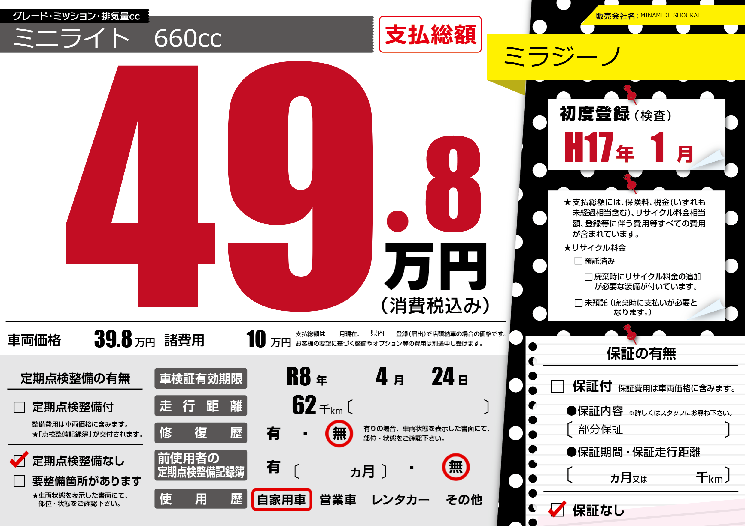 | 車名 | ミラジーノ | グレード ミッション 排気量 |