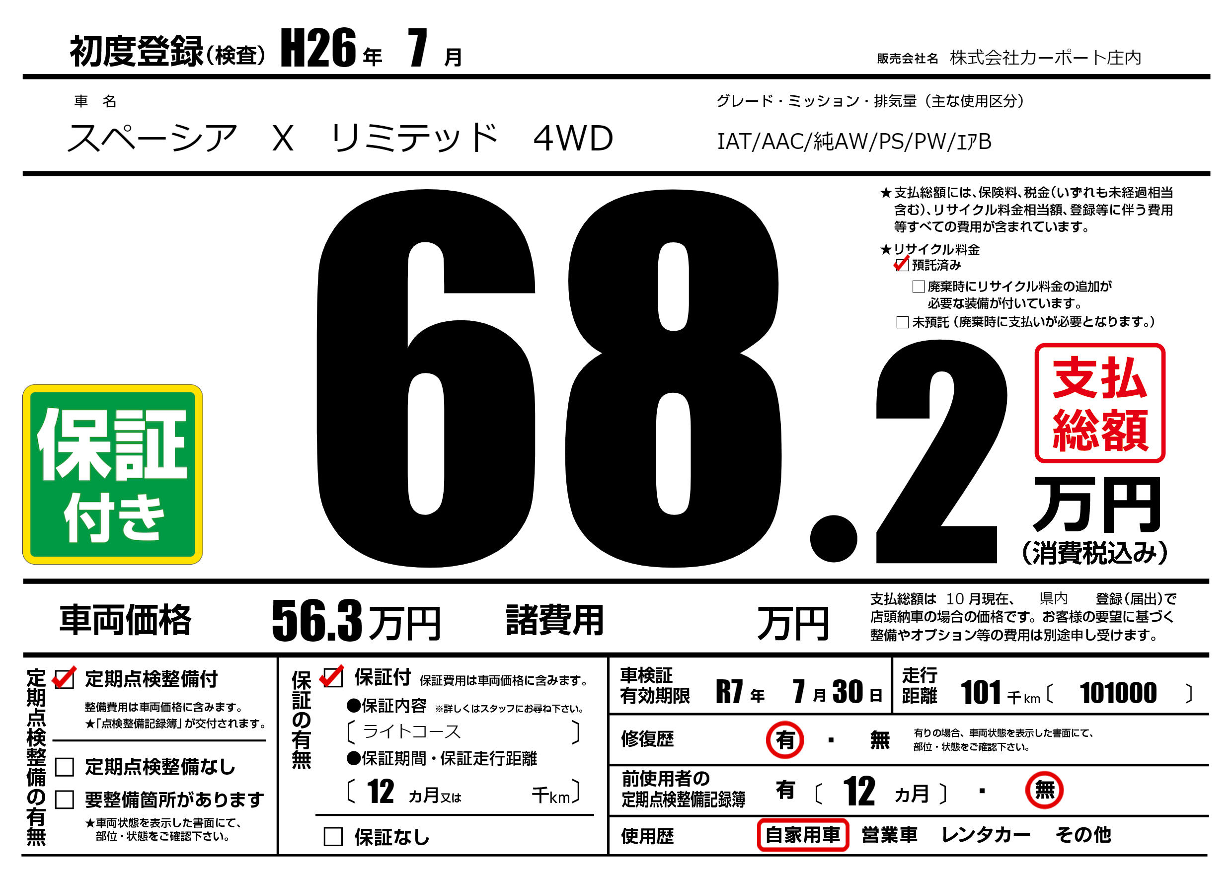 | 車名 | スペーシア X リミテッド 4WD | グレード ミッション 排気量 |