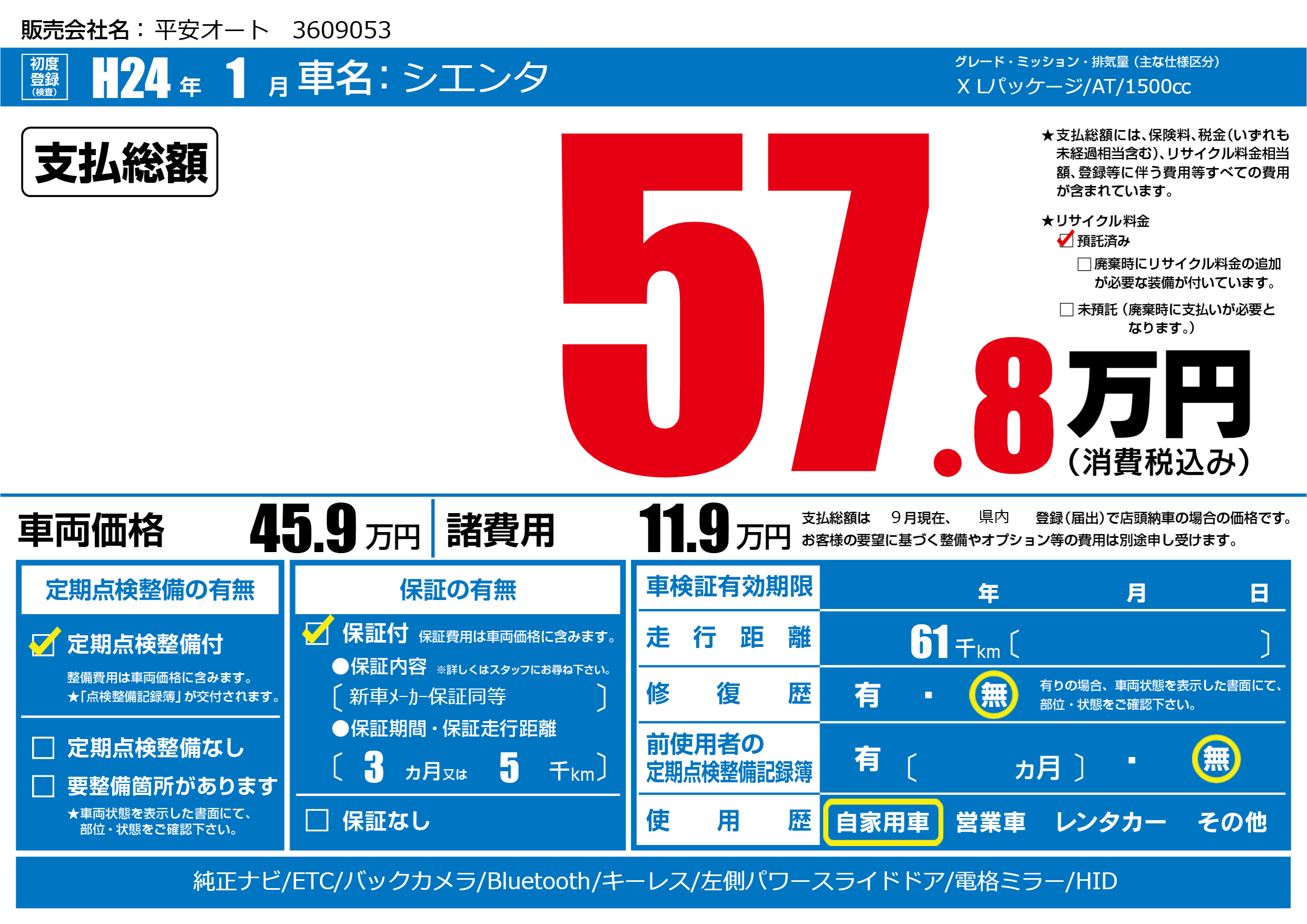 | 車名 | シエンタ | グレード ミッション 排気量 |