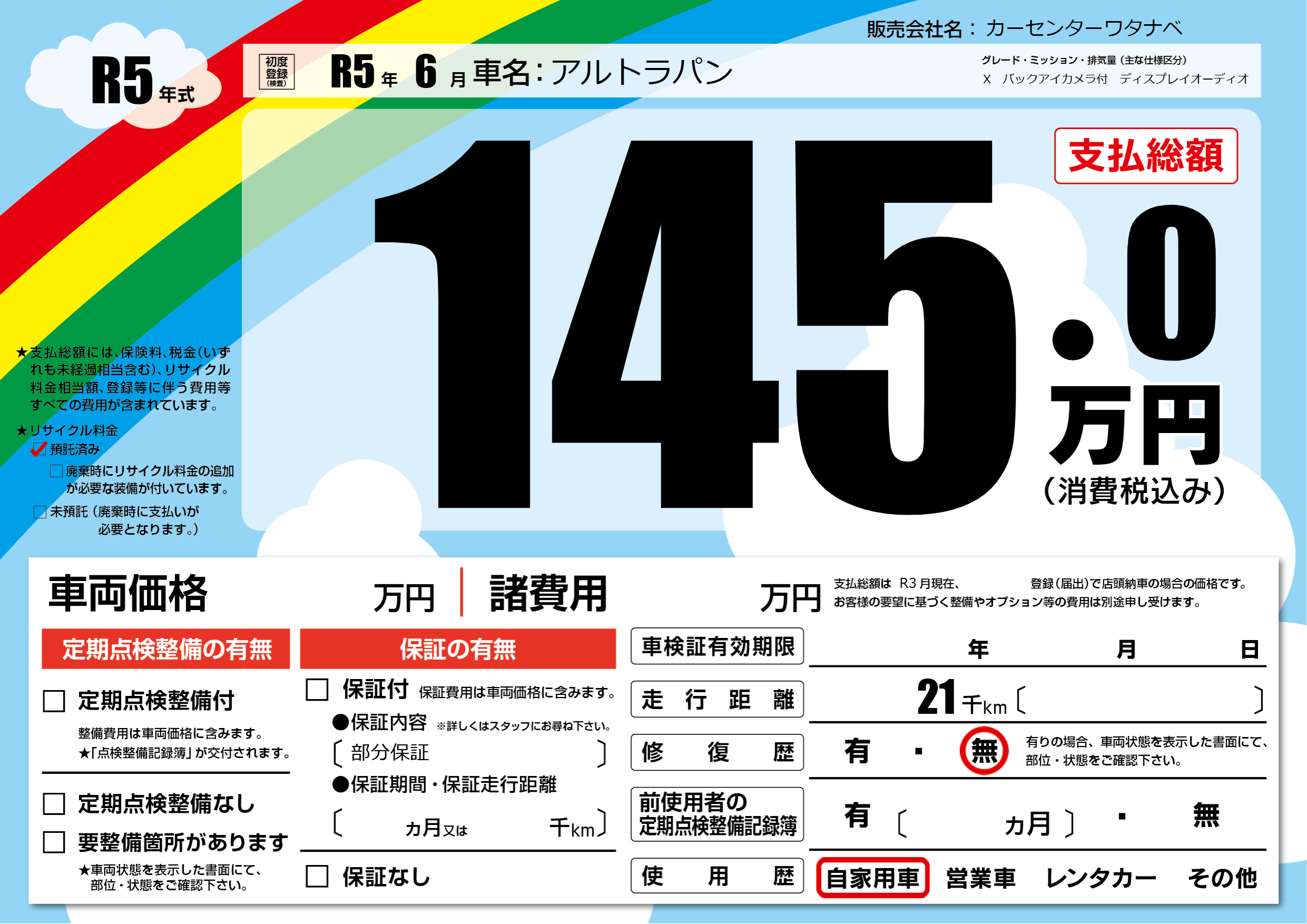 | 走行キロ | 2.1万km | 初年度登録 | R5年6月 |