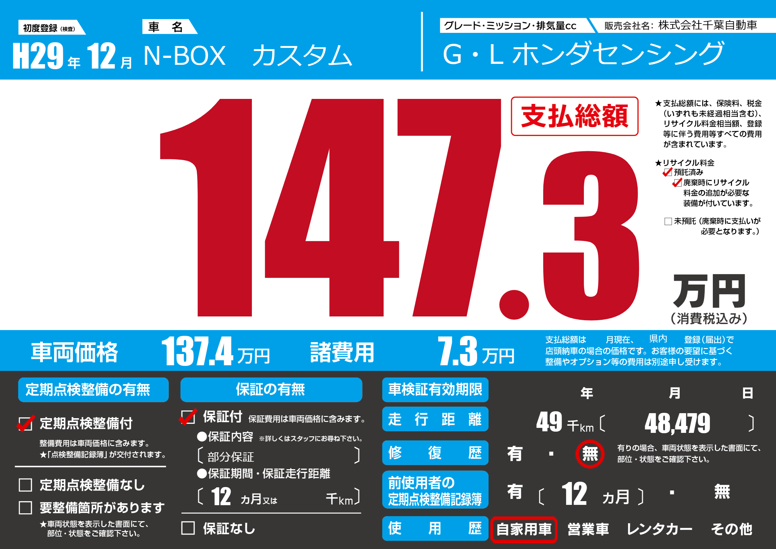 | 走行キロ | 4.9万km | 初年度登録 | H29年12月 |