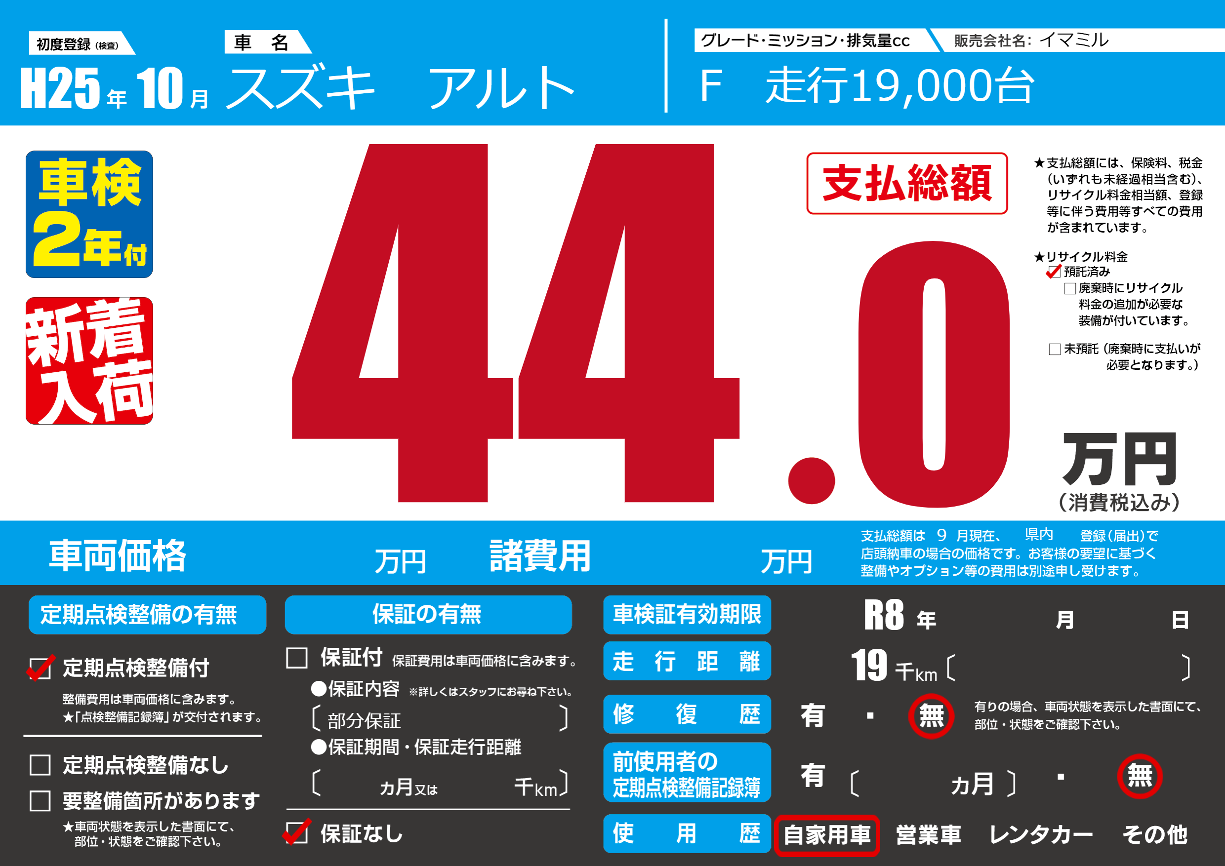 | 車名 | スズキ アルト | グレード ミッション 排気量 |