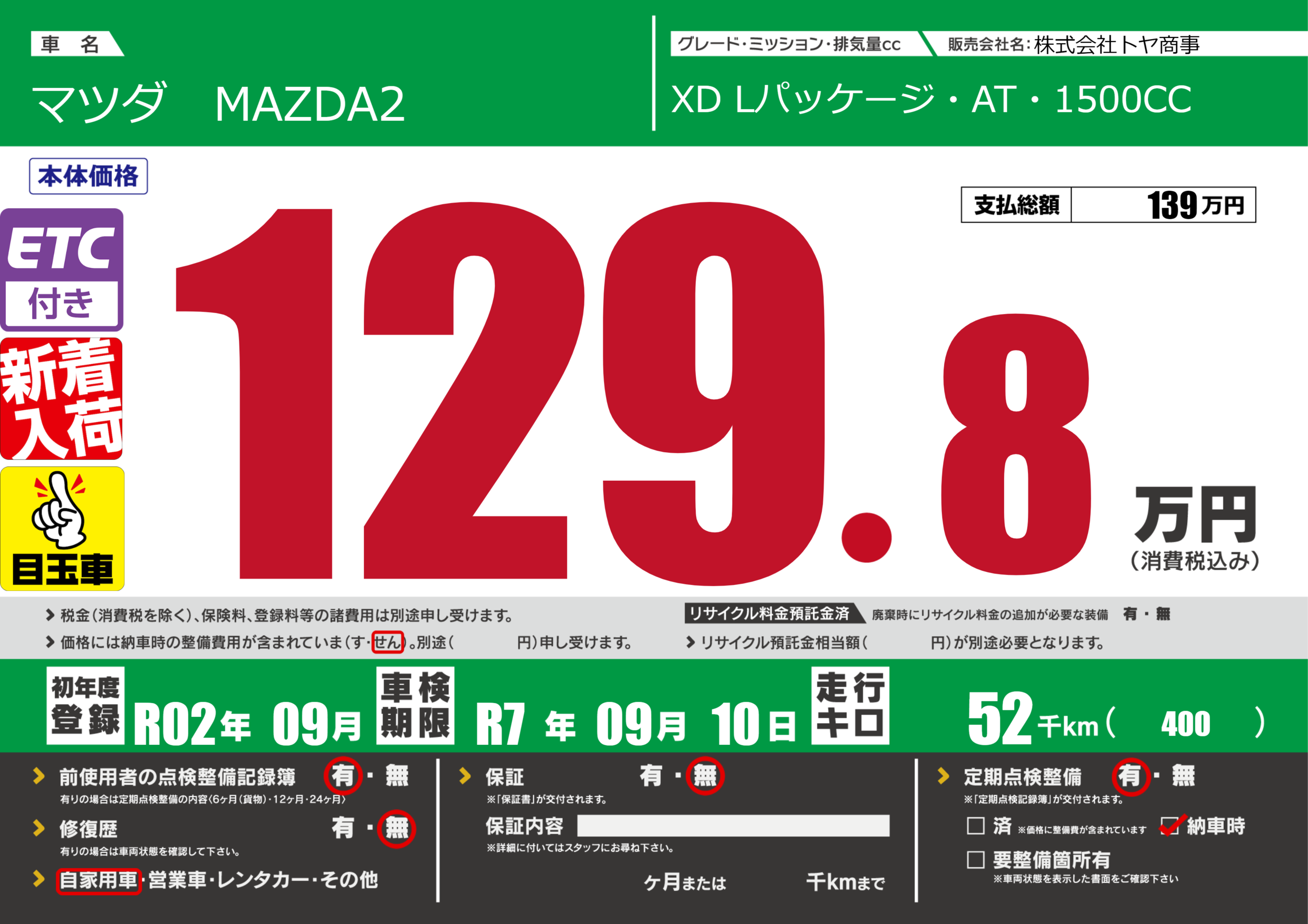 | 車名 | マツダ MAZDA2 | グレード ミッション 排気量 |