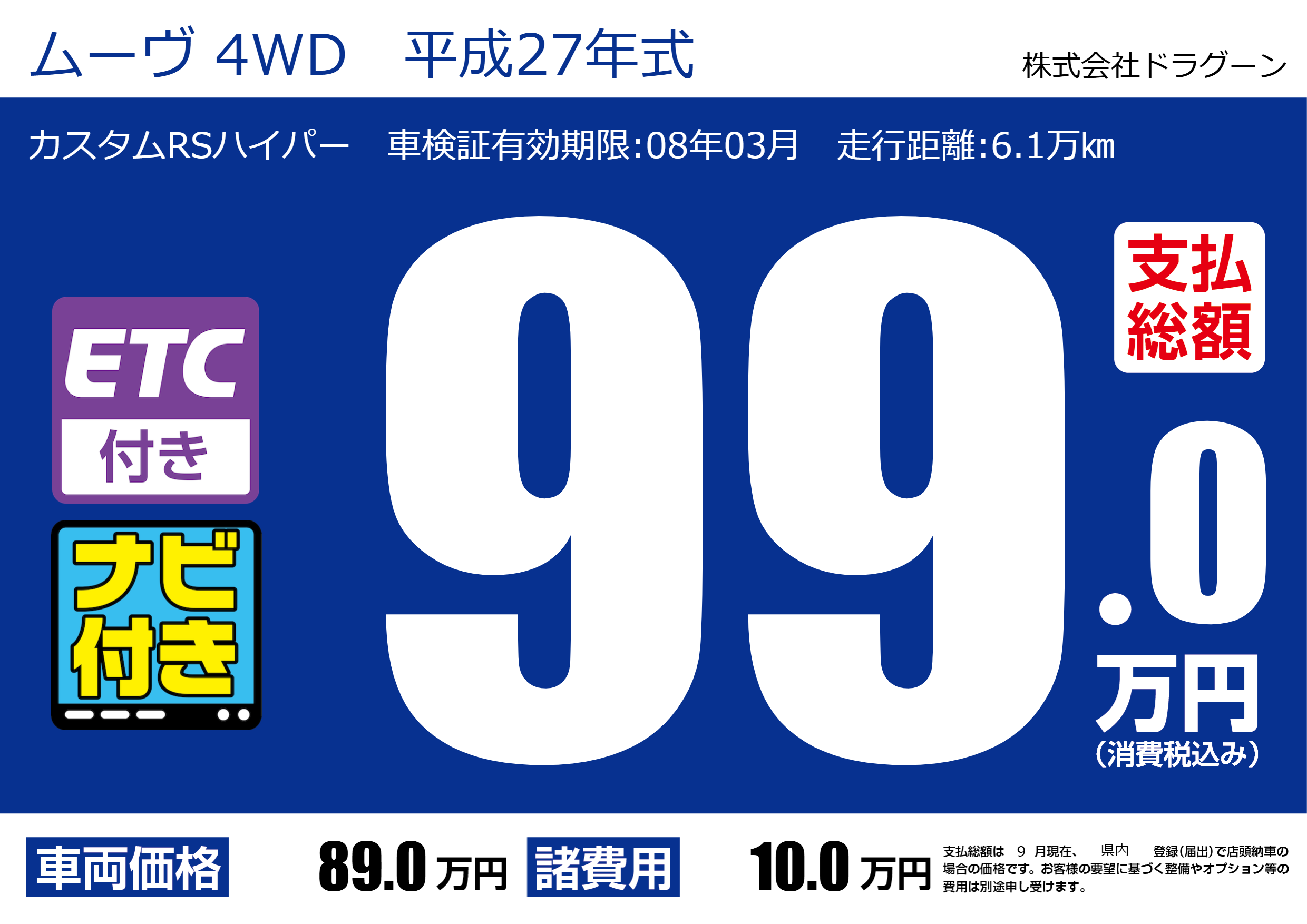 | 車名 | ムーヴ 4WD 平成27年式 | グレード ミッション 排気量 |