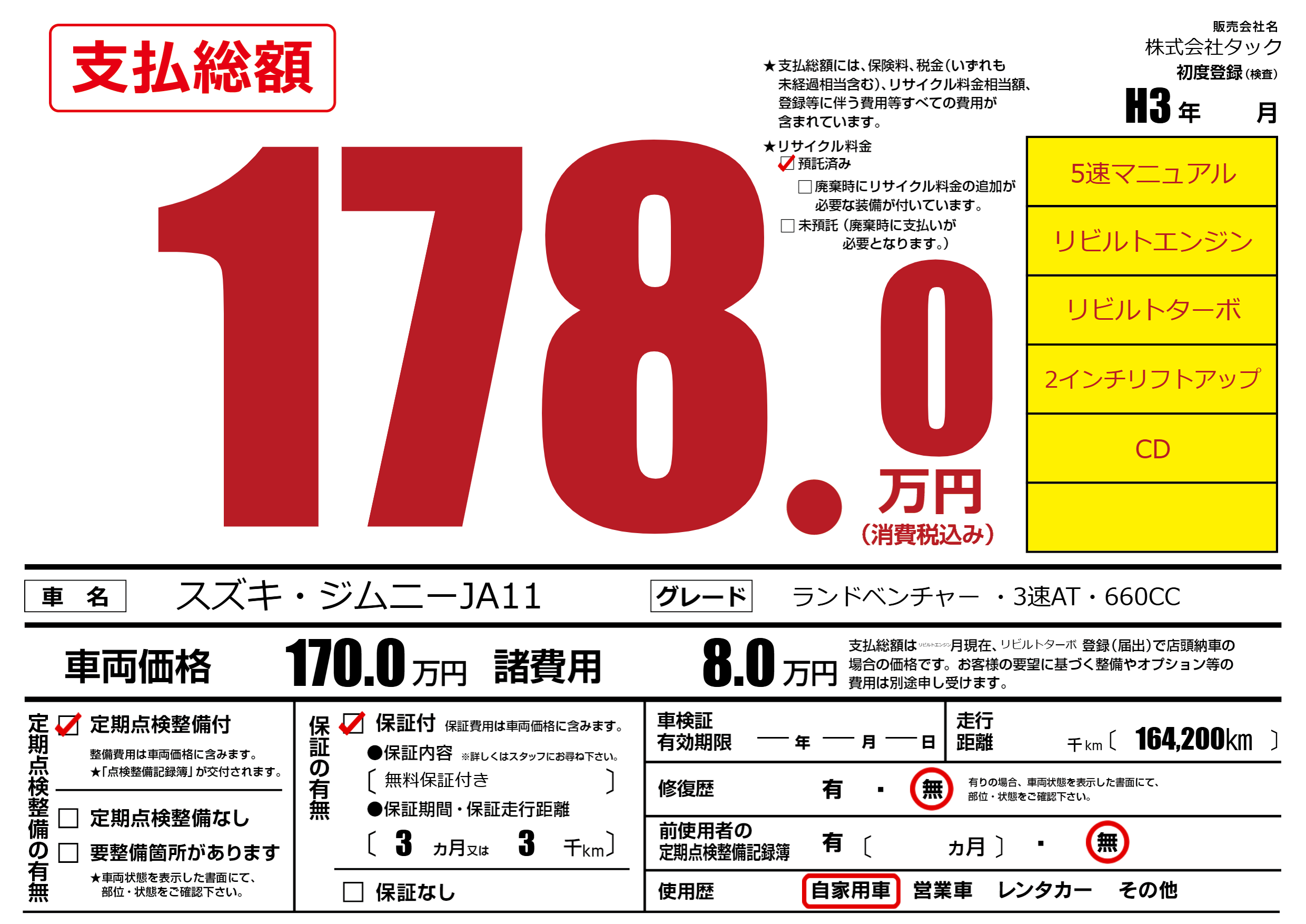 | 車名 | スズキ・ジムニーJA11 | グレード ミッション 排気量 |