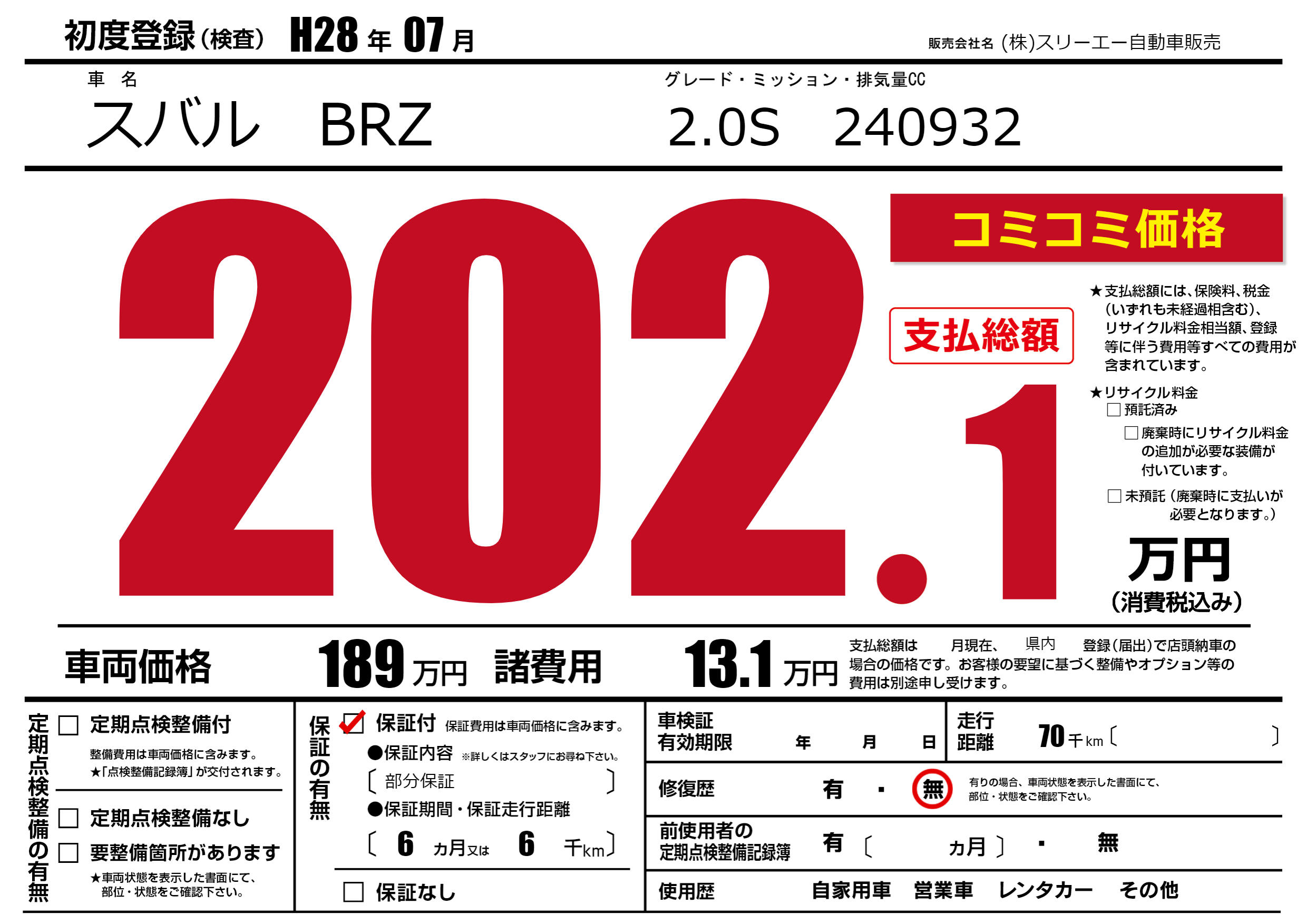 | 車名 | スバル BRZ | グレード ミッション 排気量 |