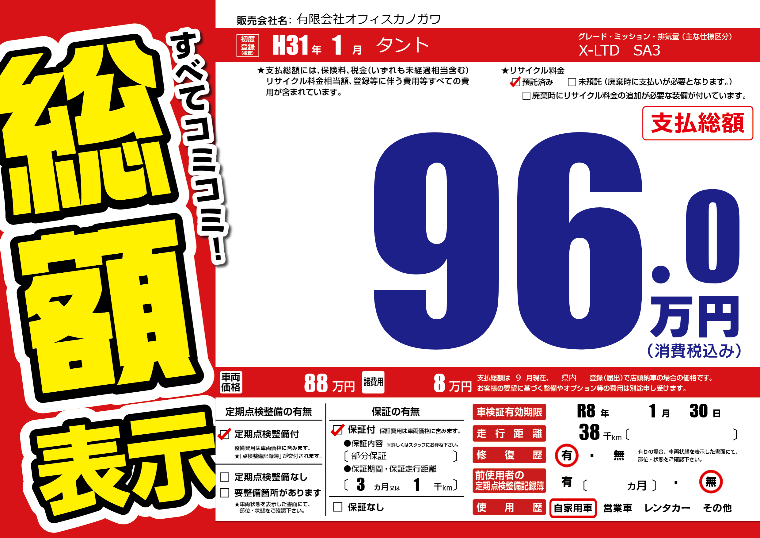 | 走行キロ | 3.8万km | 初年度登録 | H31年1月 |
