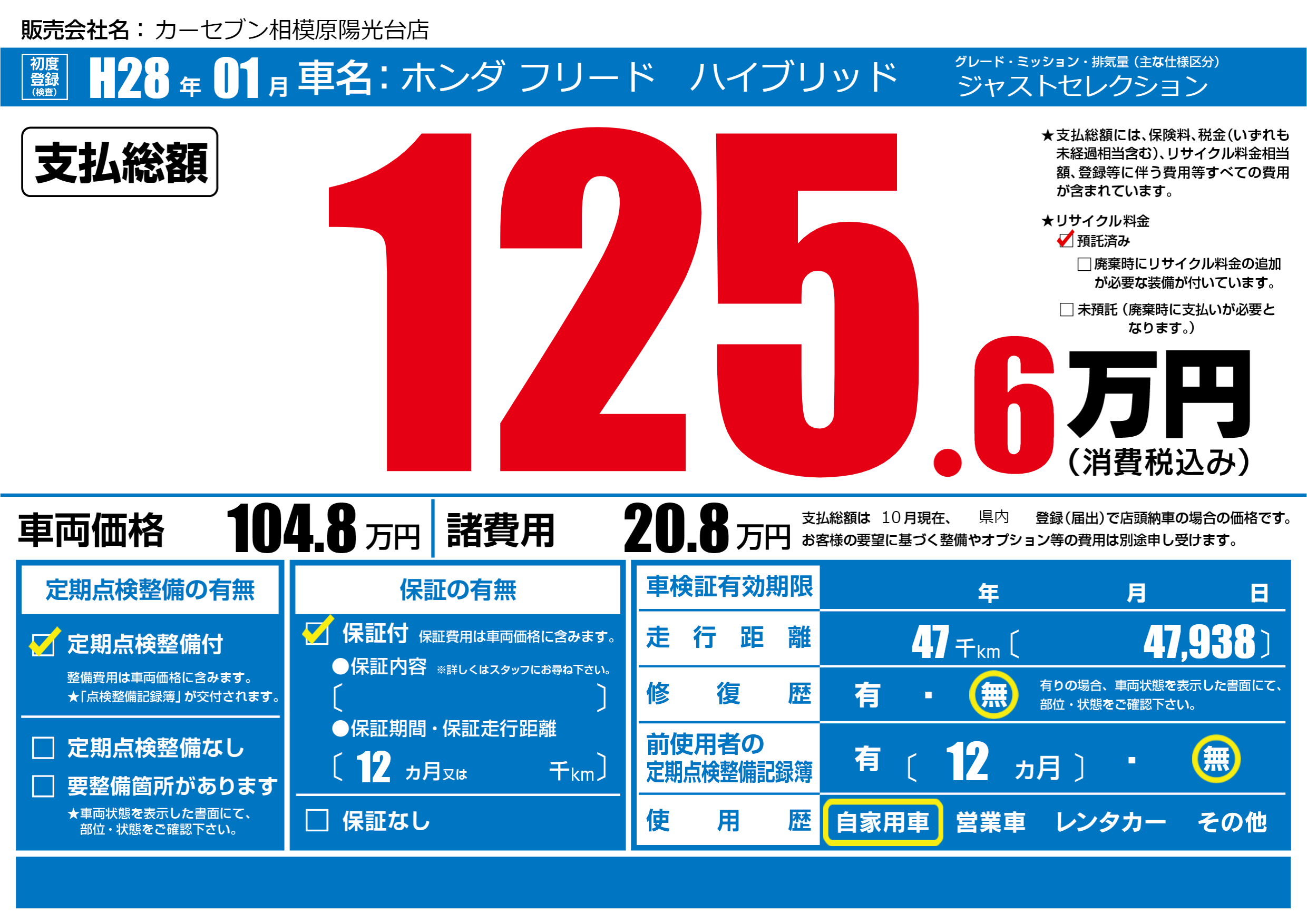 | 車名 | ホンダ フリード ハイブリッド | グレード ミッション 排気量 |