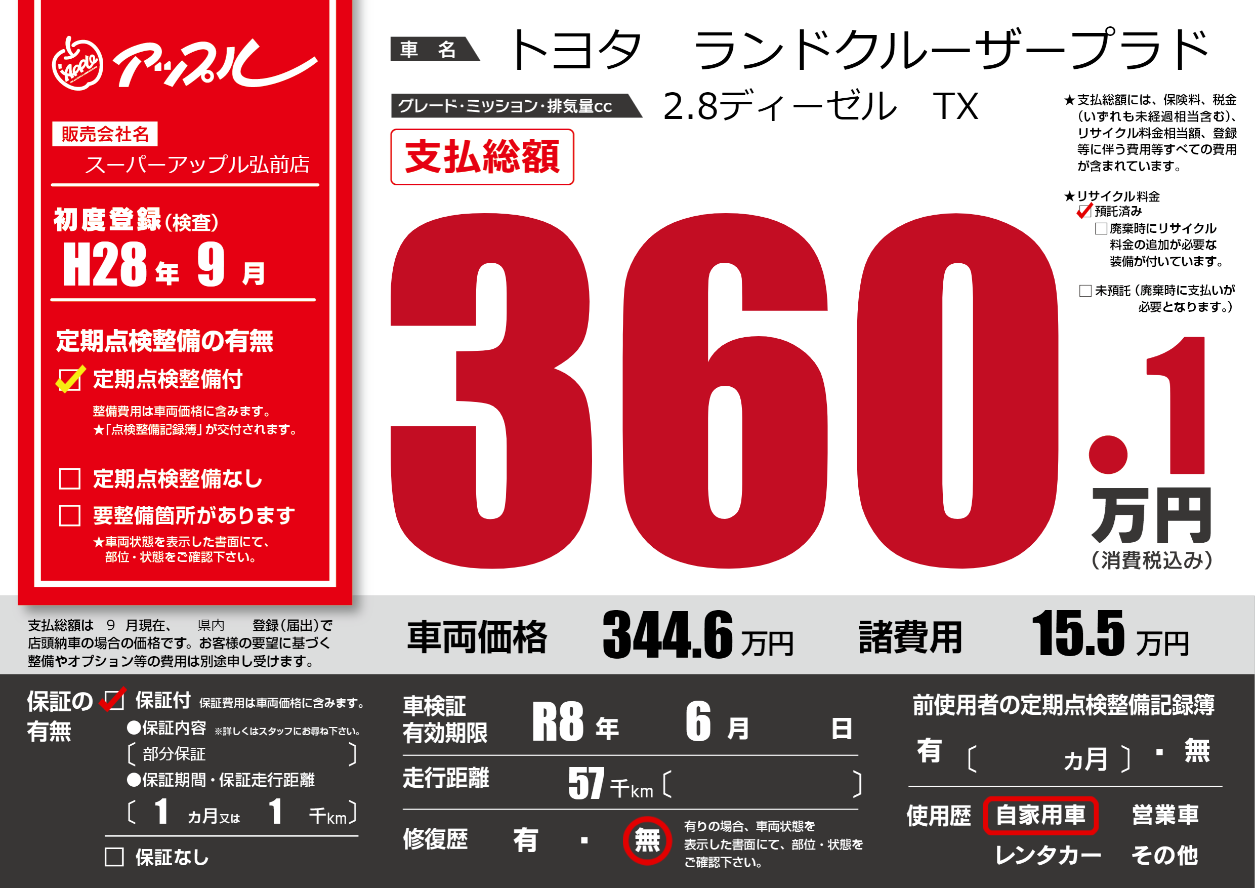| 車名 | トヨタ ランドクルーザープラド | グレード ミッション 排気量 |
