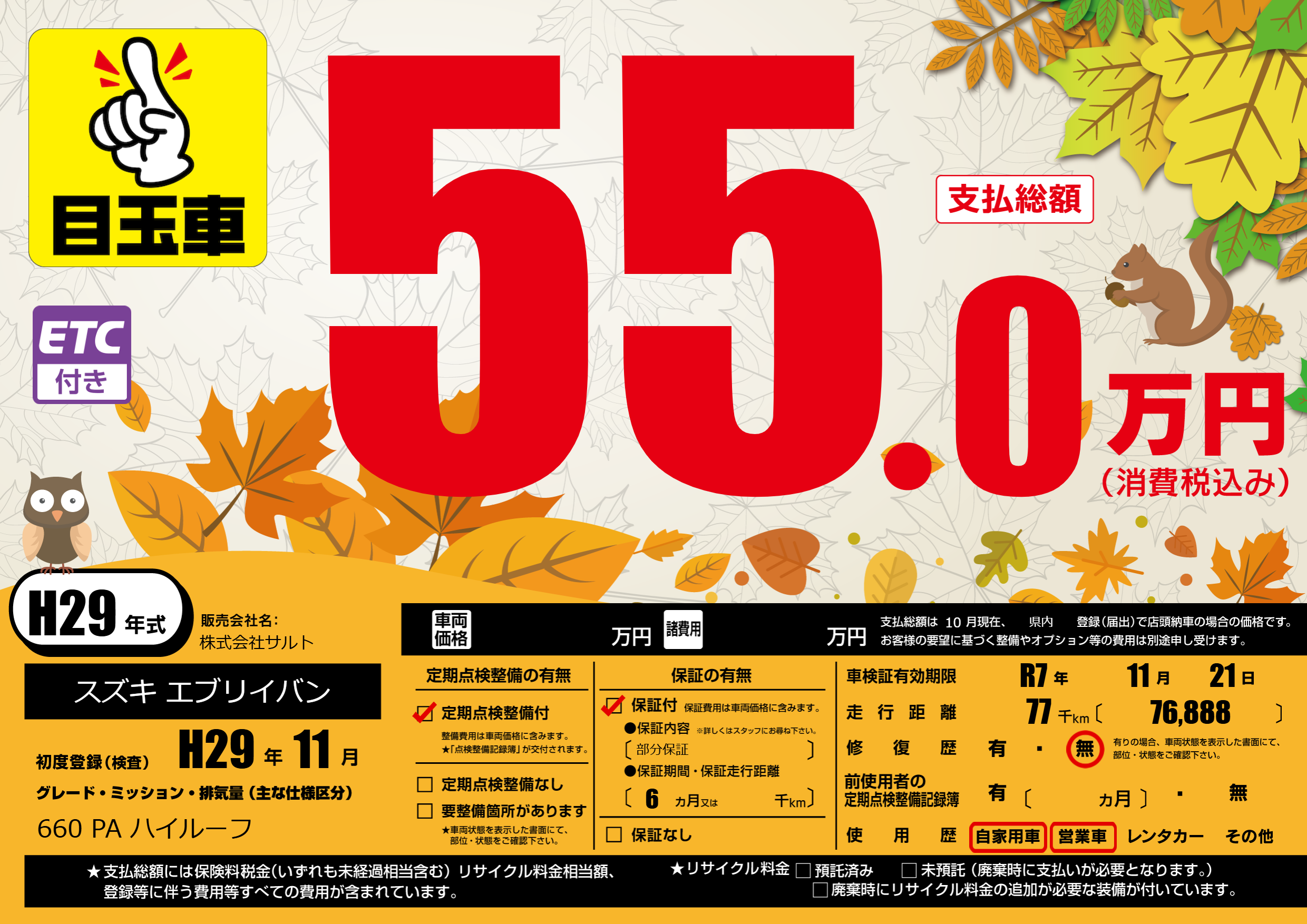 | 走行キロ | 7.7万km | 初年度登録 | H29年11月 |