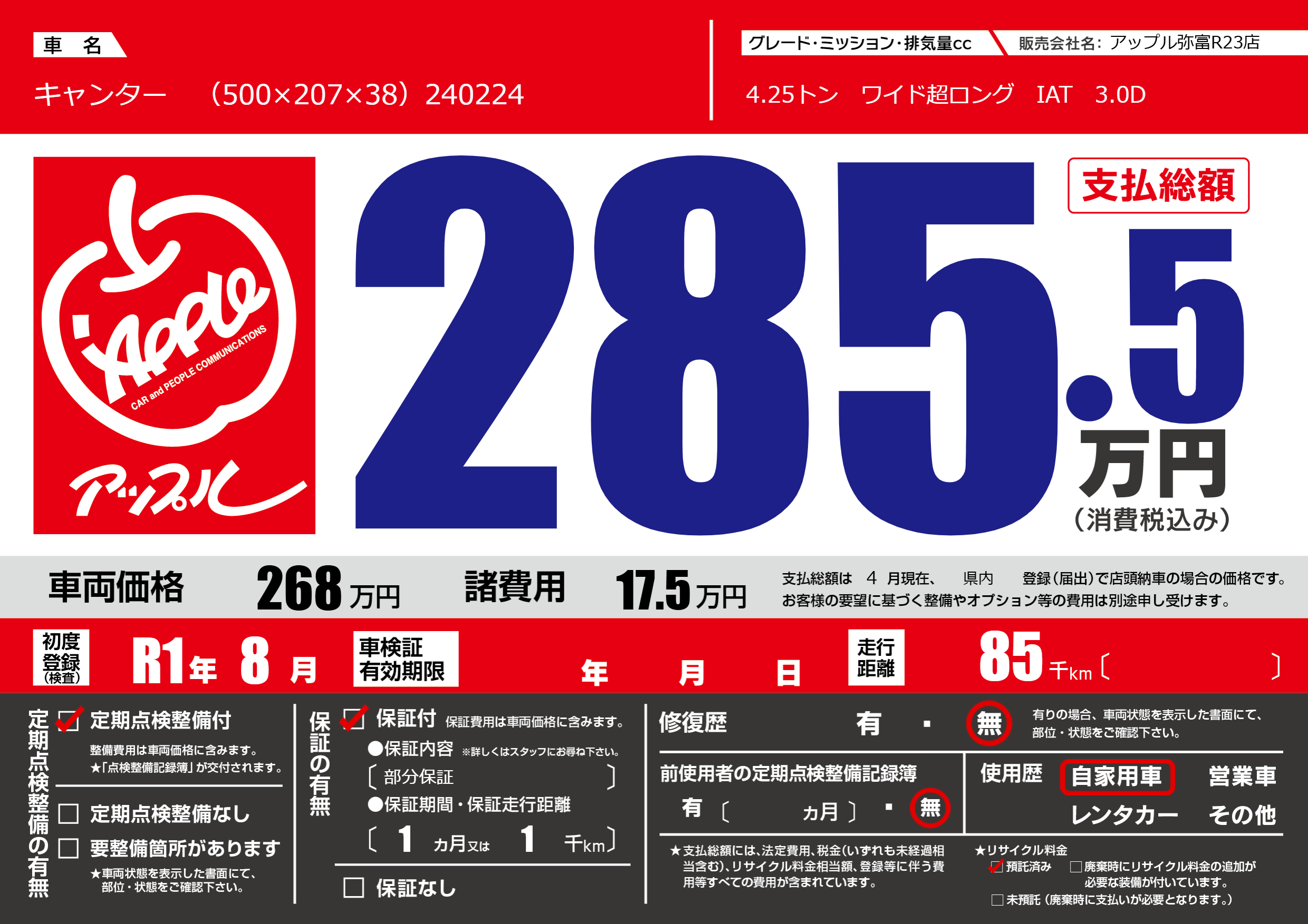 | 車名 | キャンター (500×207×38)240224 | グレード ミッション 排気量 |
