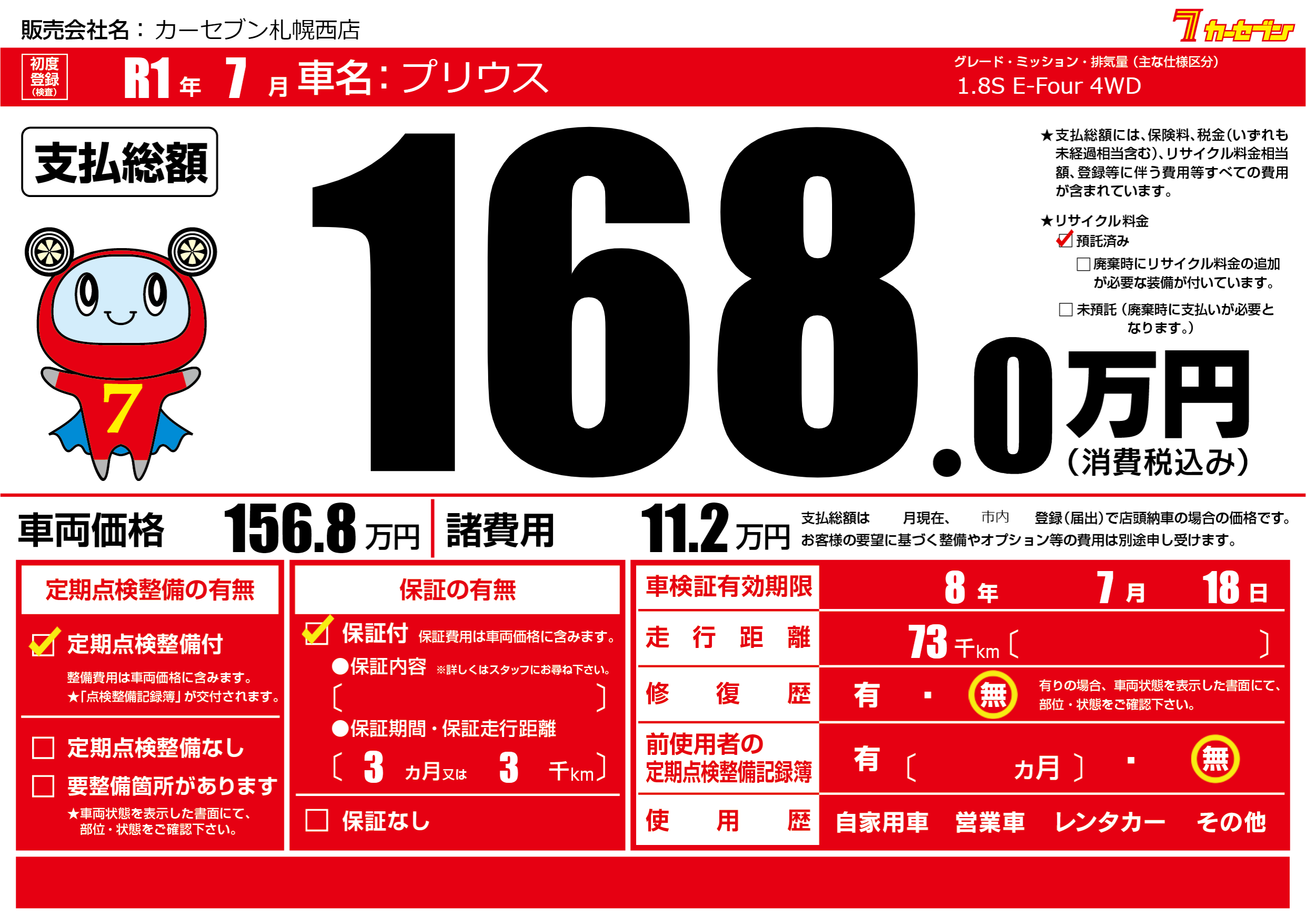 | 走行キロ | 7.3万km | 初年度登録 | R1年7月 |