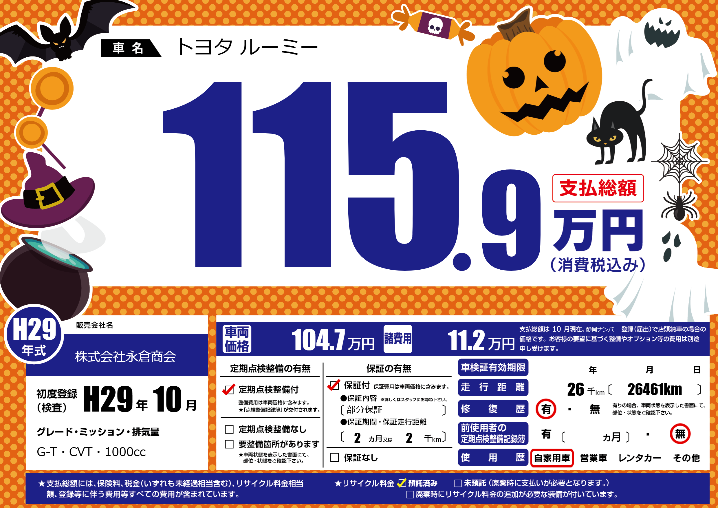 | 車名 | トヨタ ルーミー | グレード ミッション 排気量 |
