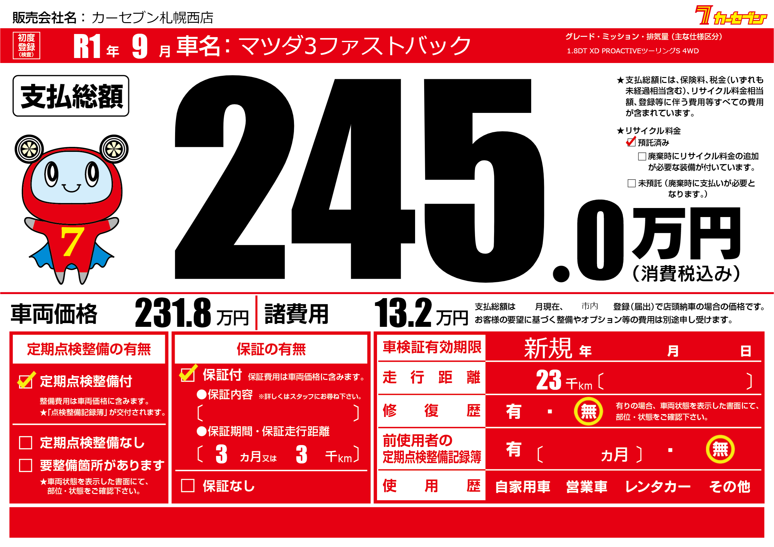 | 車名 | マツダ3ファストバック | グレード ミッション 排気量 |