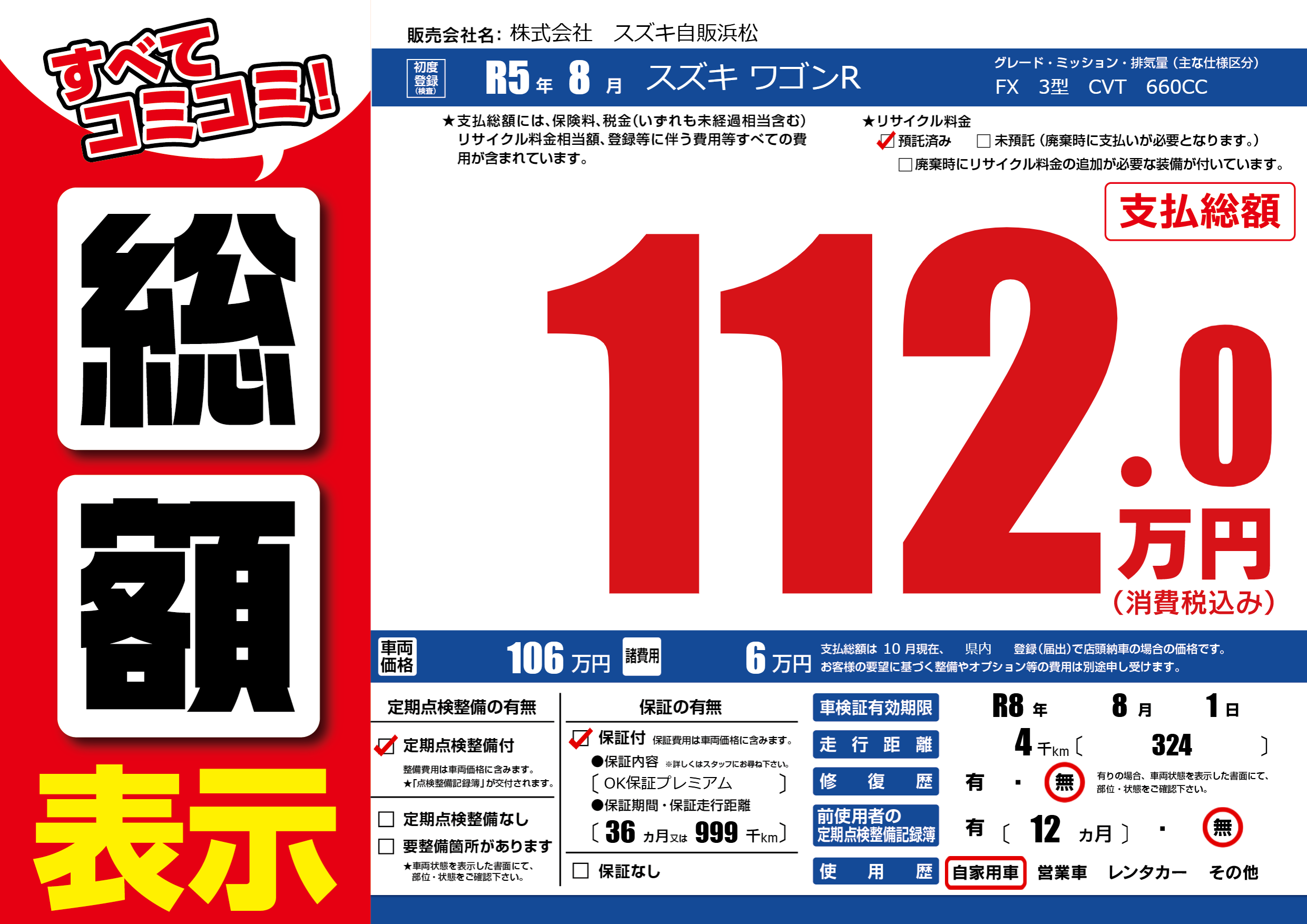 | 車名 | スズキ ワゴンR | グレード ミッション 排気量 |