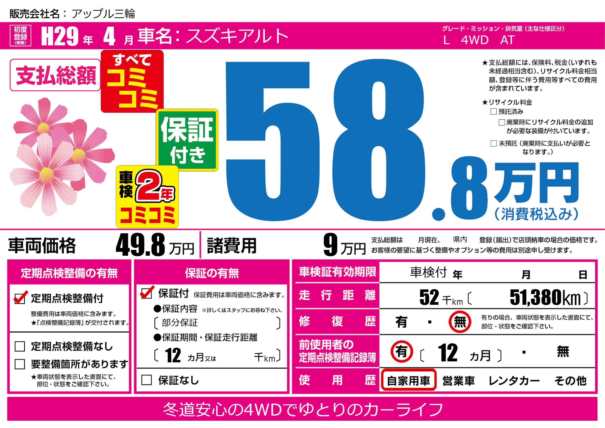 | 車名 | スズキアルト | グレード ミッション 排気量 |