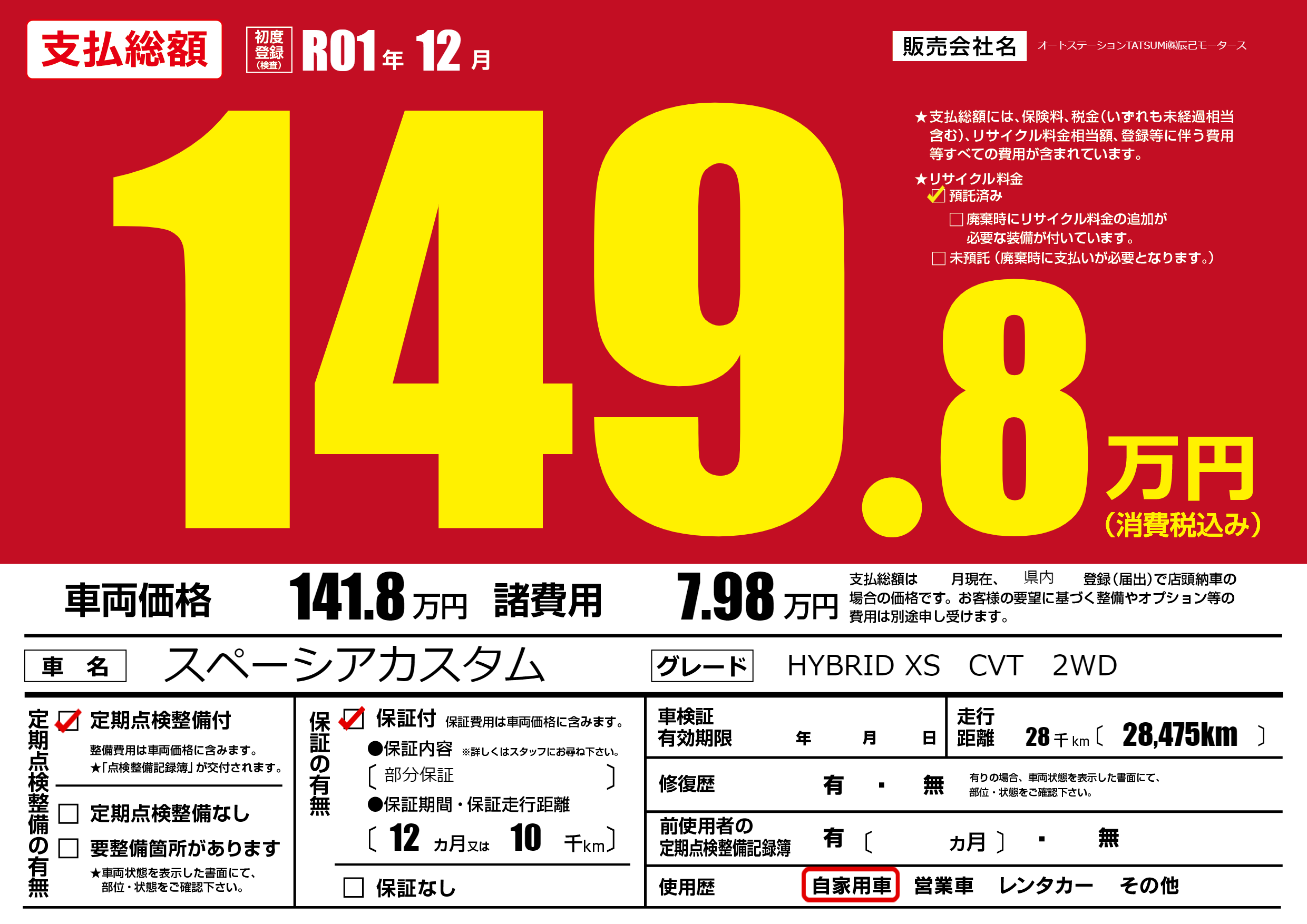 | 走行キロ | 2.8万km | 初年度登録 | R01年12月 |