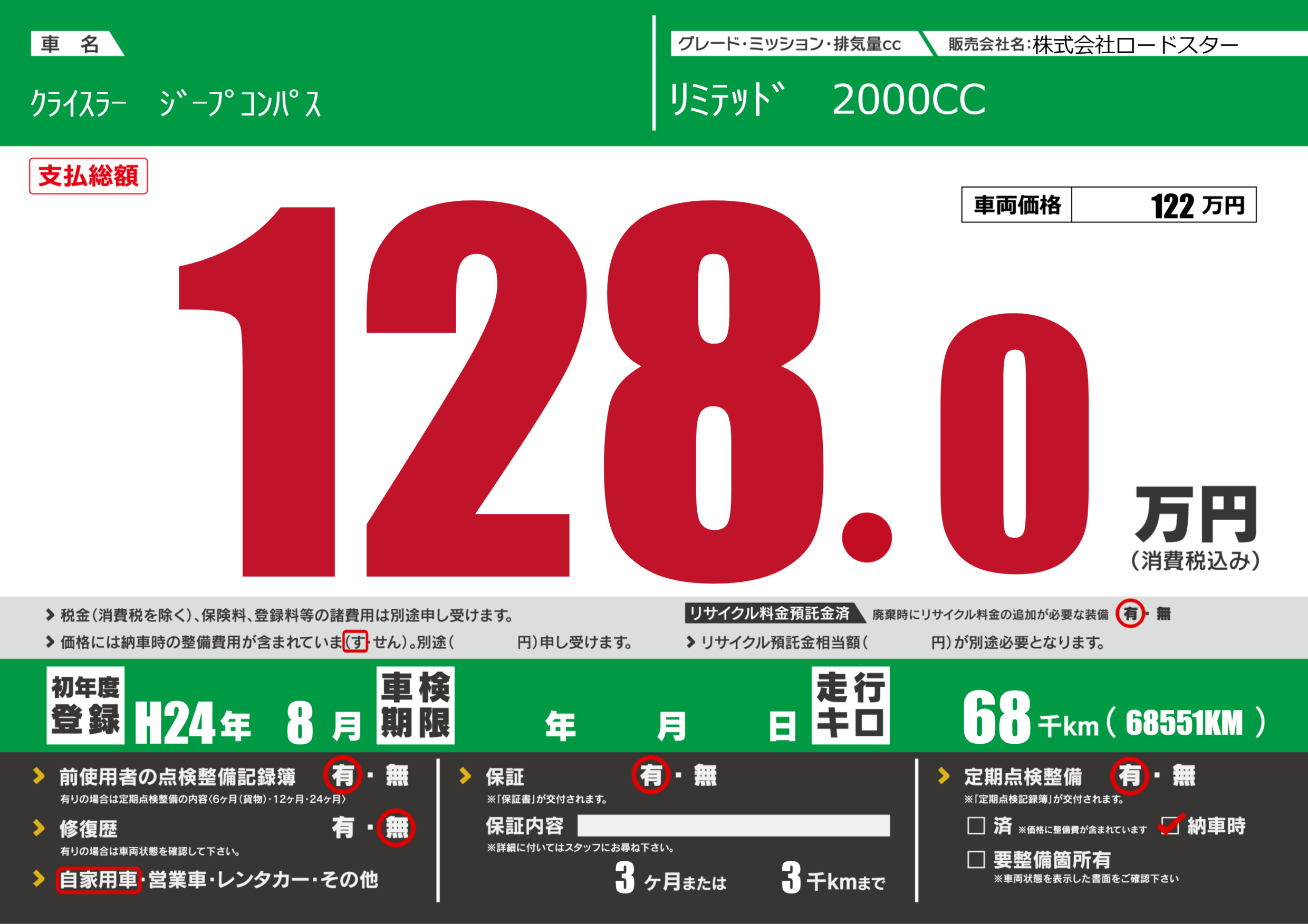| 車名 | クライスラー ジープコンパス | グレード ミッション 排気量 |