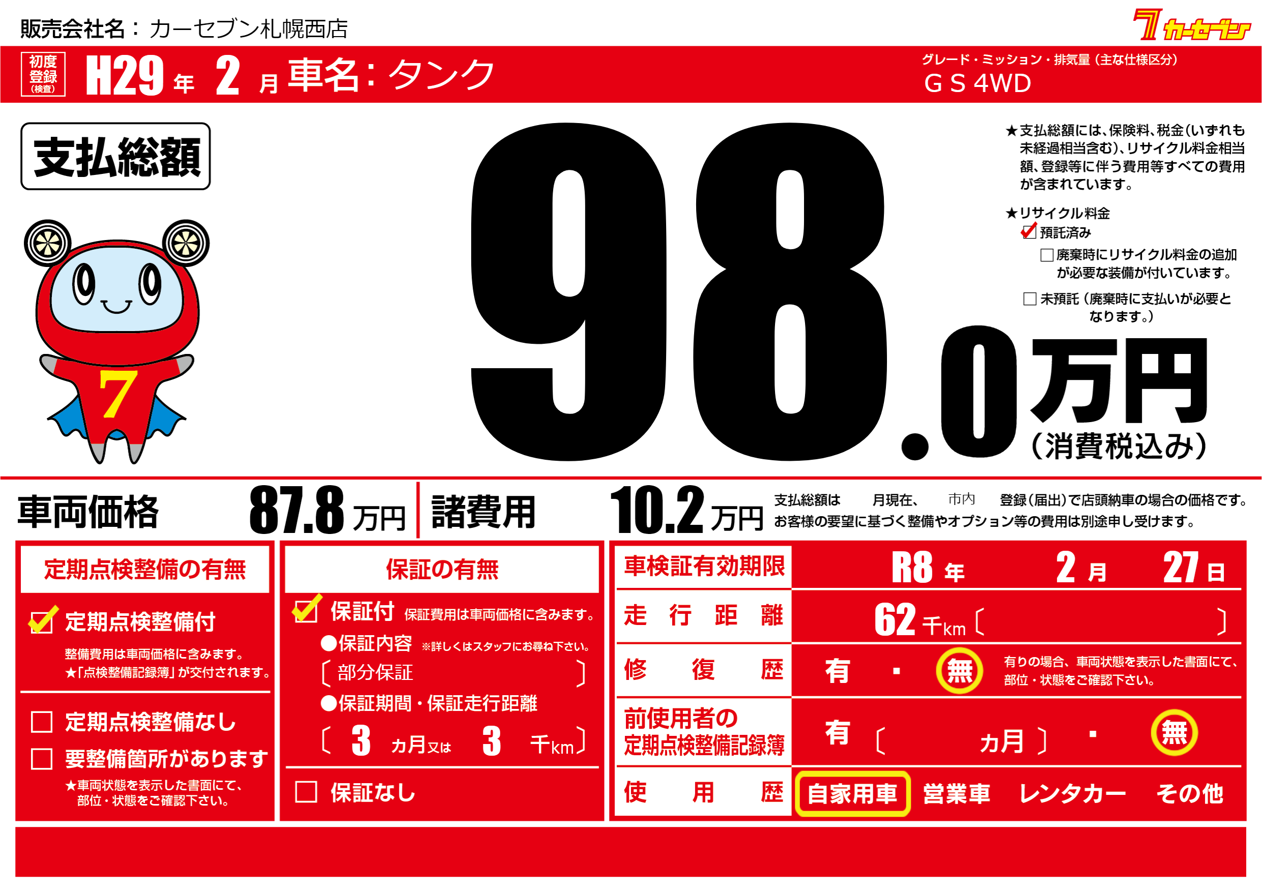 | 走行キロ | 6.2万km | 初年度登録 | H29年2月 |