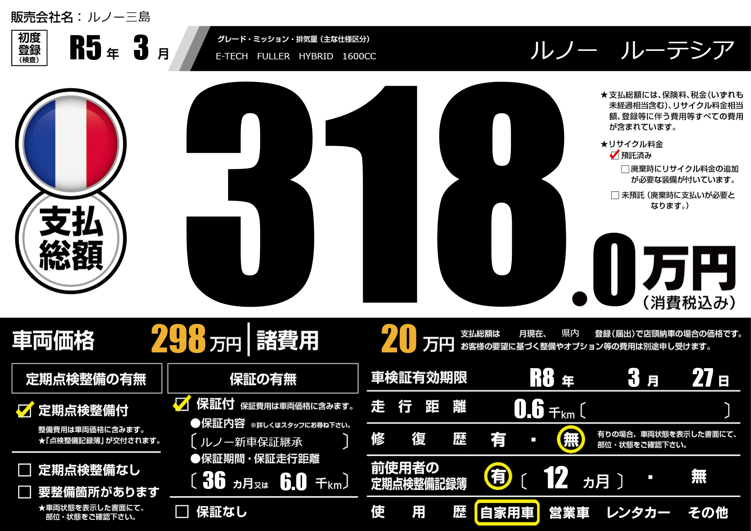 保証なし 保証内容(ルノー新車保証継承) 36ヶ月または(6.0)千kmまで |