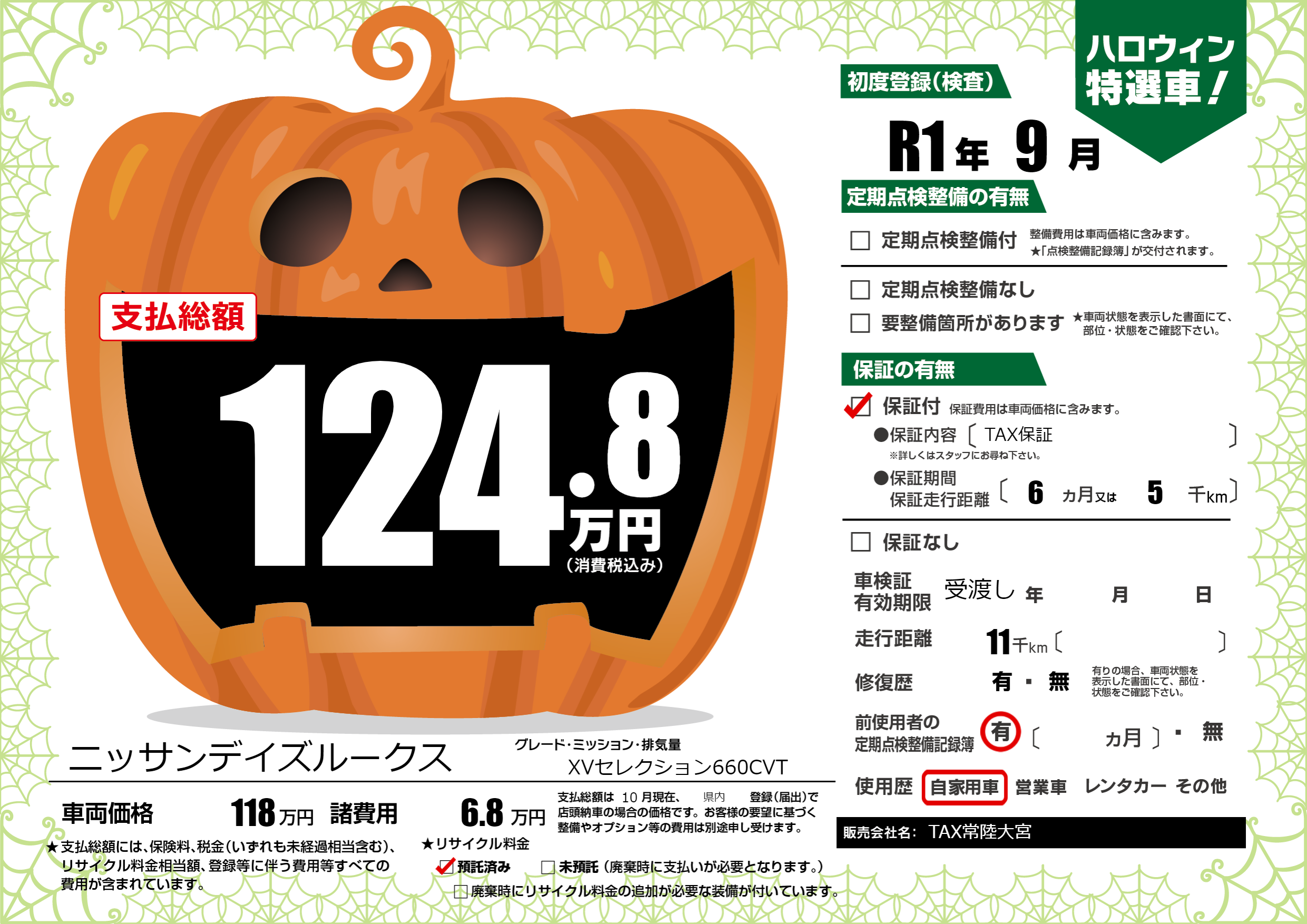 | 走行キロ | 1.1万km | 初年度登録 | R1年9月 |