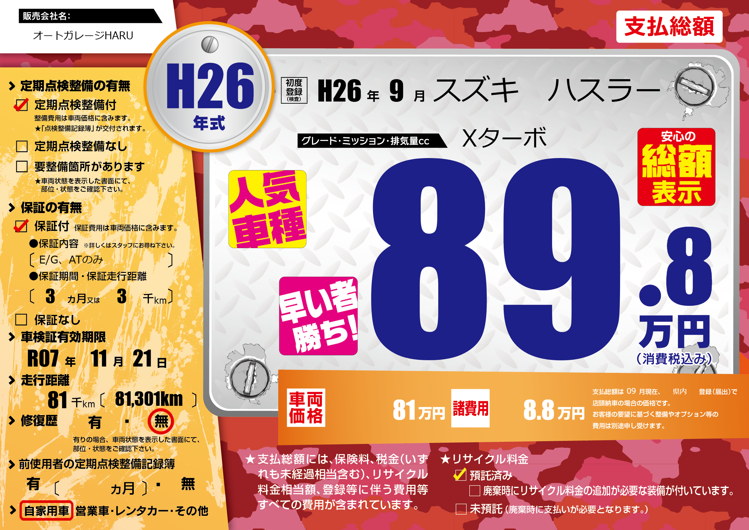 | 車名 | スズキ ハスラー | グレード ミッション 排気量 |