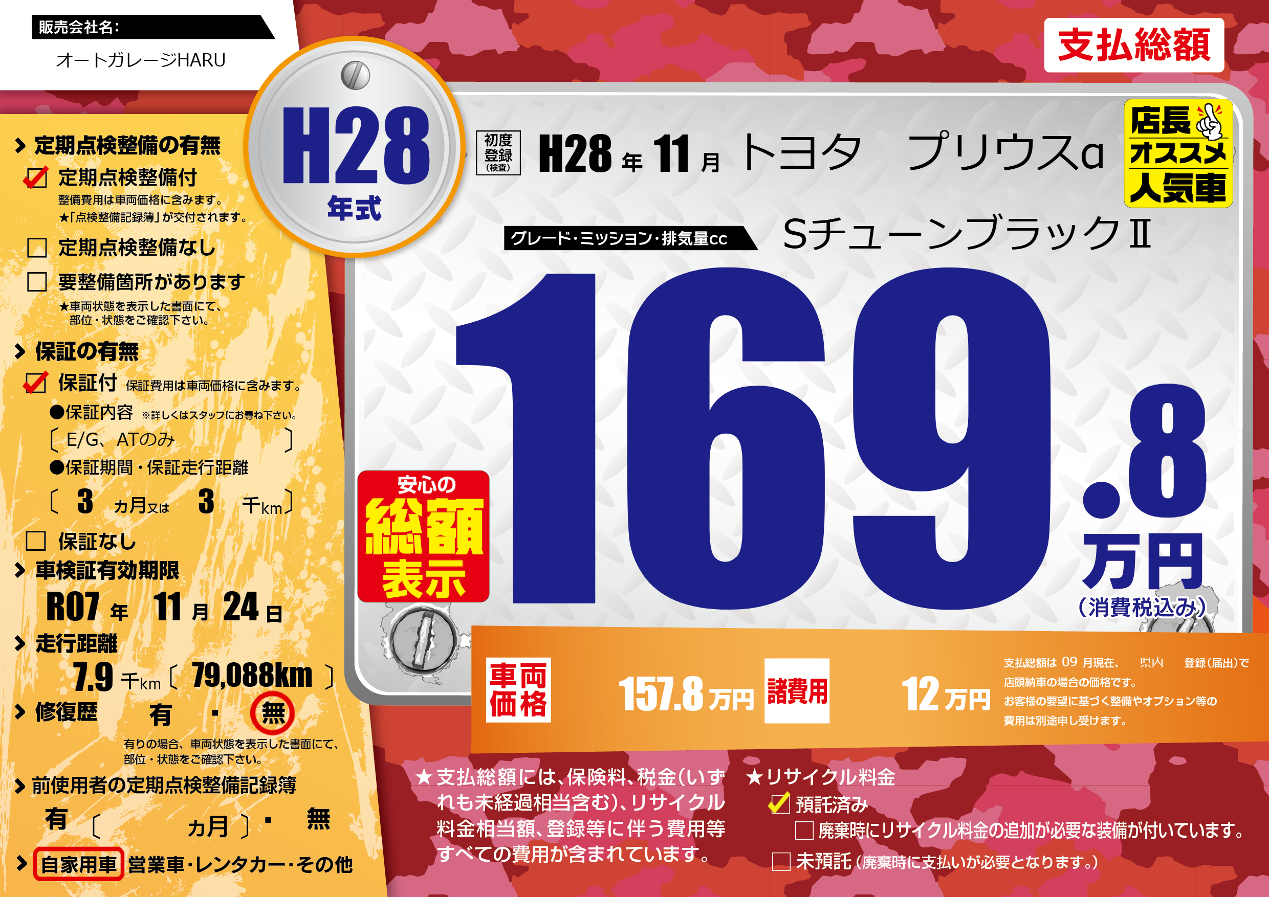 | 車名 | トヨタ プリウスα | グレード ミッション 排気量 |