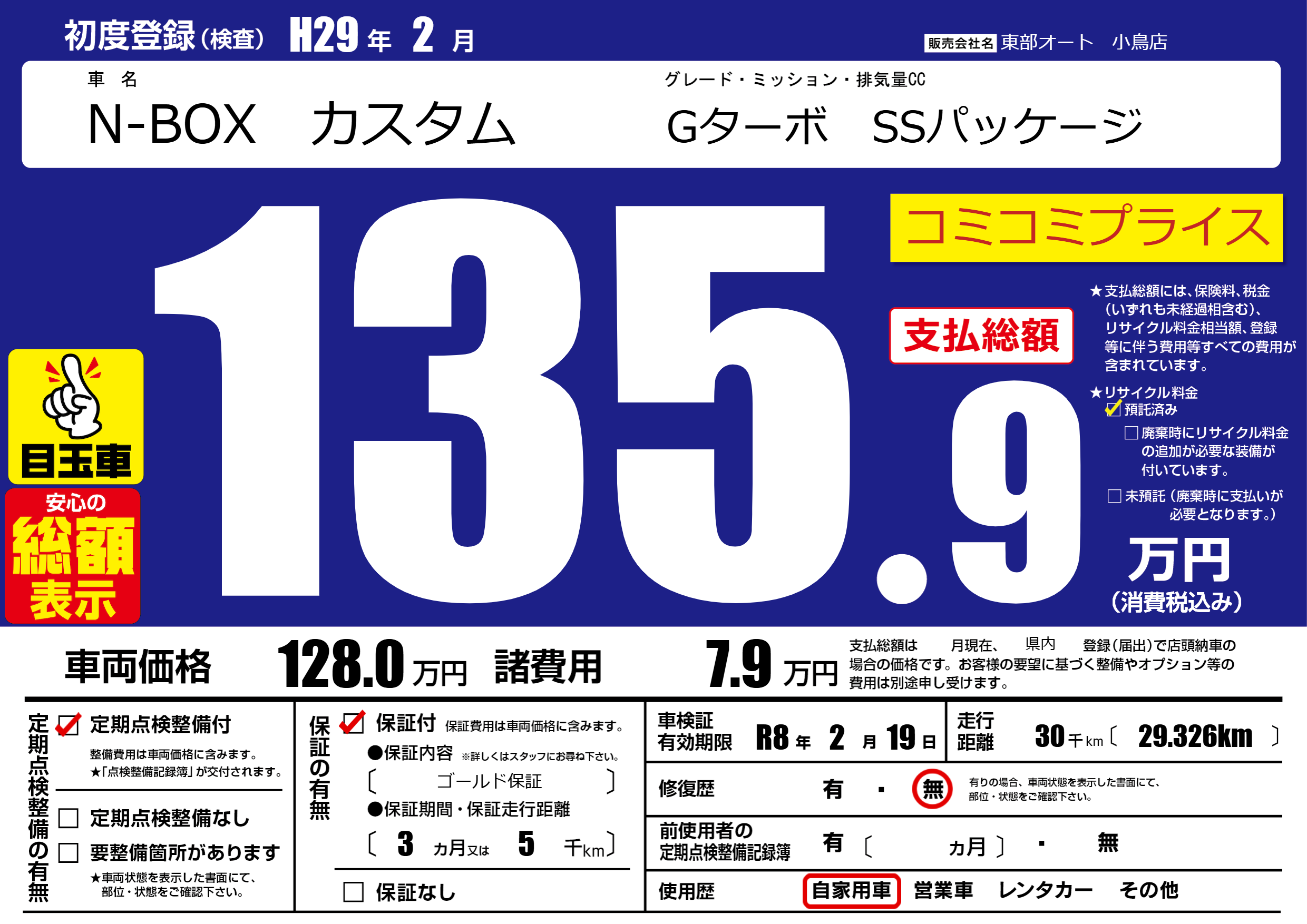 | 走行キロ | 3万km | 初年度登録 | H29年2月 |