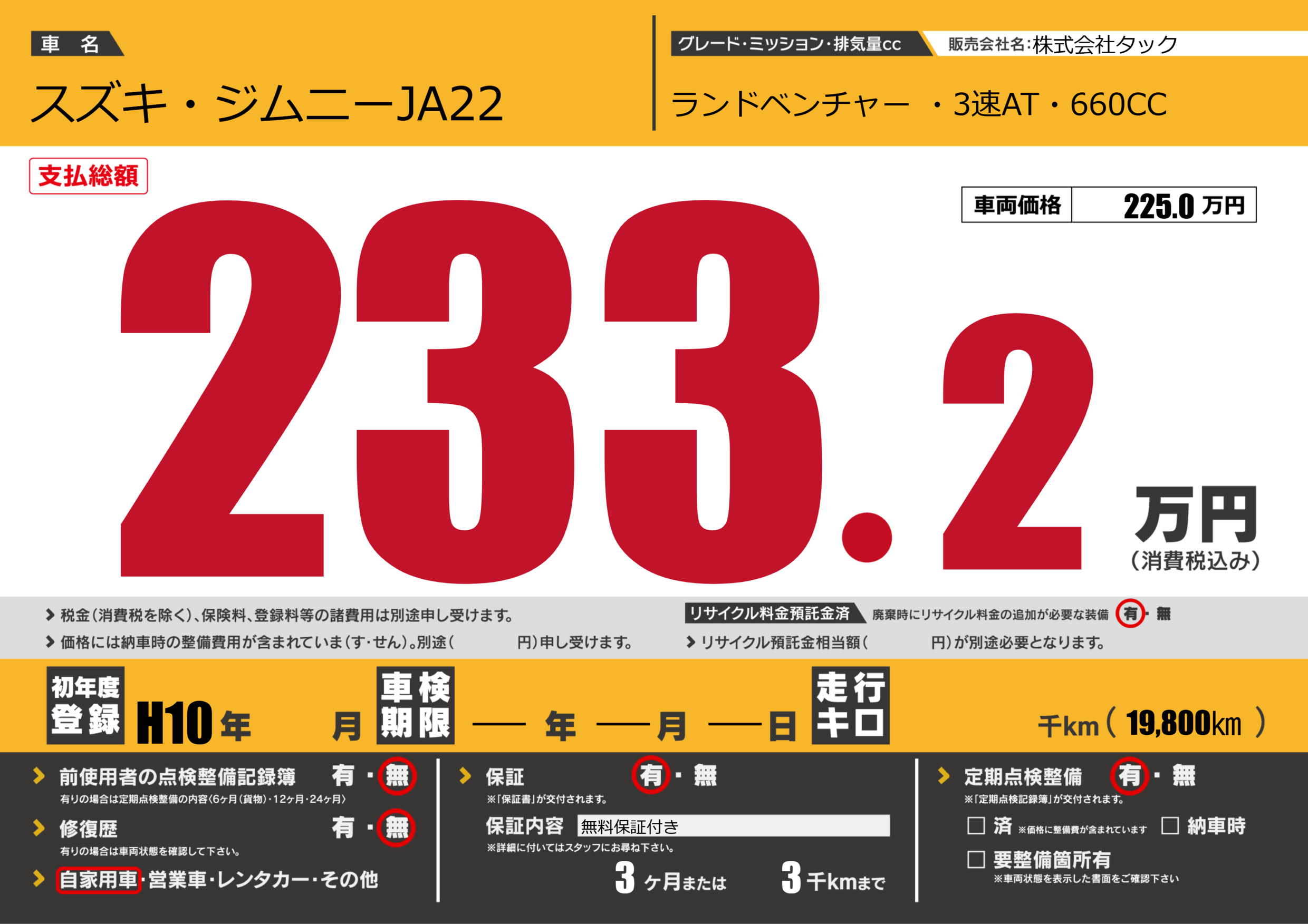 | 車名 | スズキ・ジムニーJA22 | グレード ミッション 排気量 |