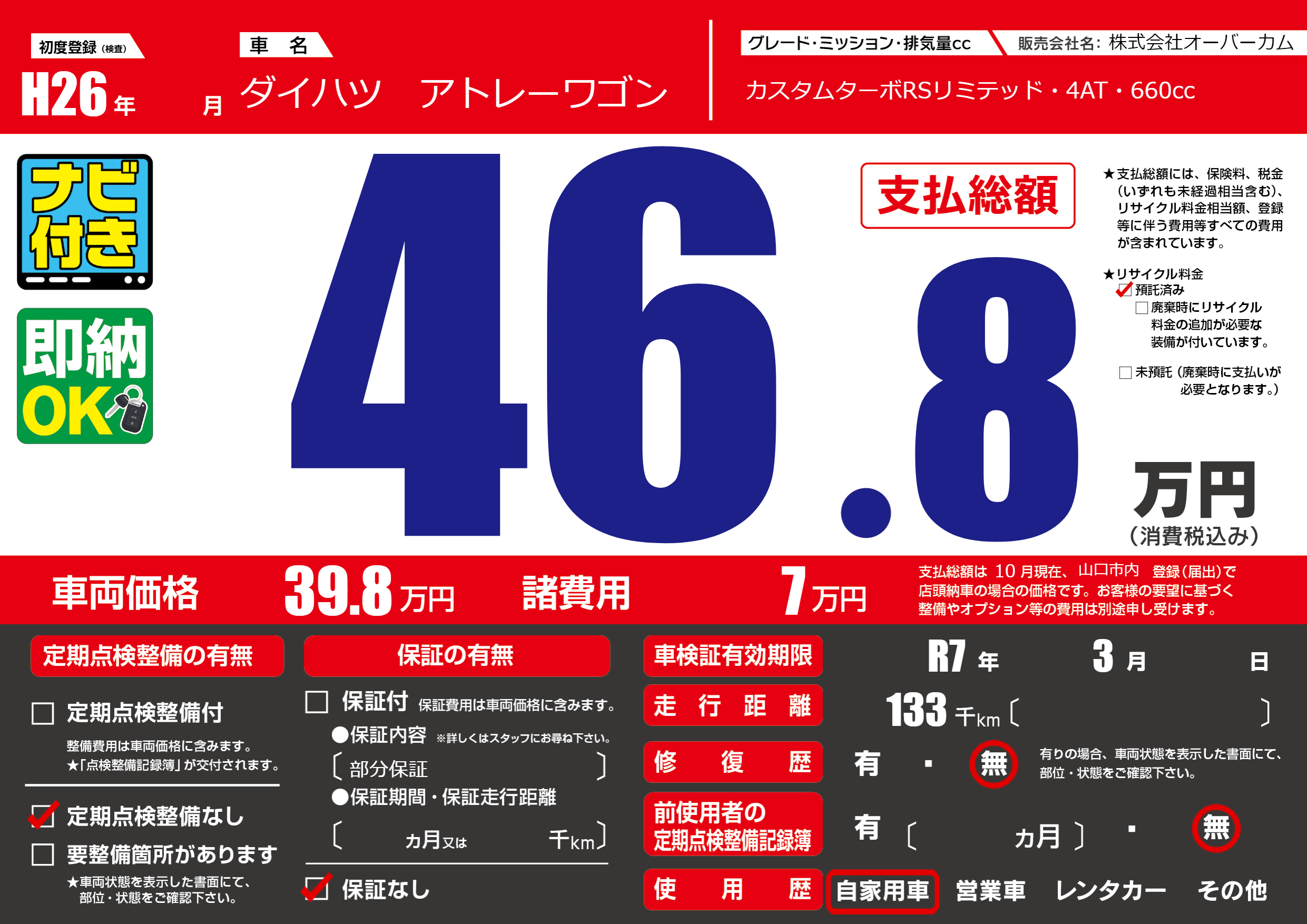 | 走行キロ | 13.3万km | 初年度登録 | H26年---月 |