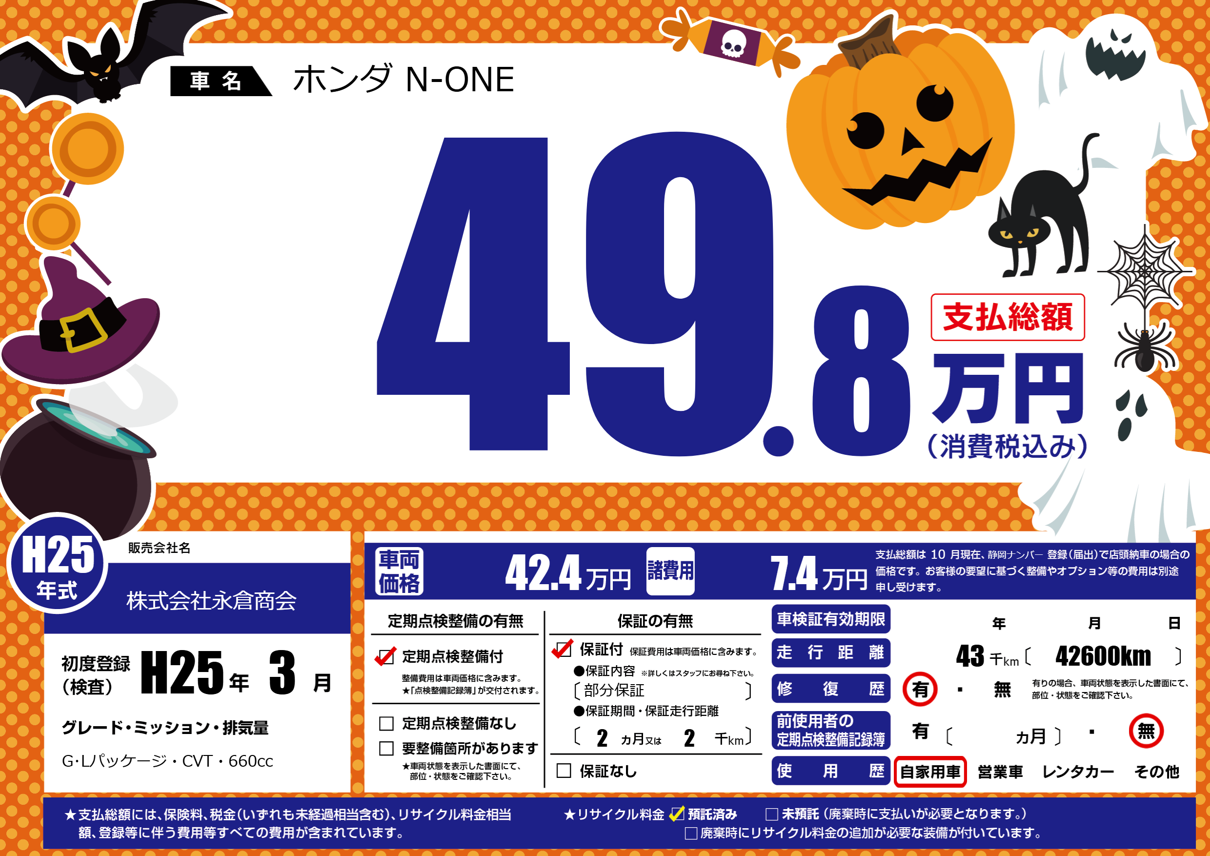 | 車名 | ホンダ N-ONE | グレード ミッション 排気量 |