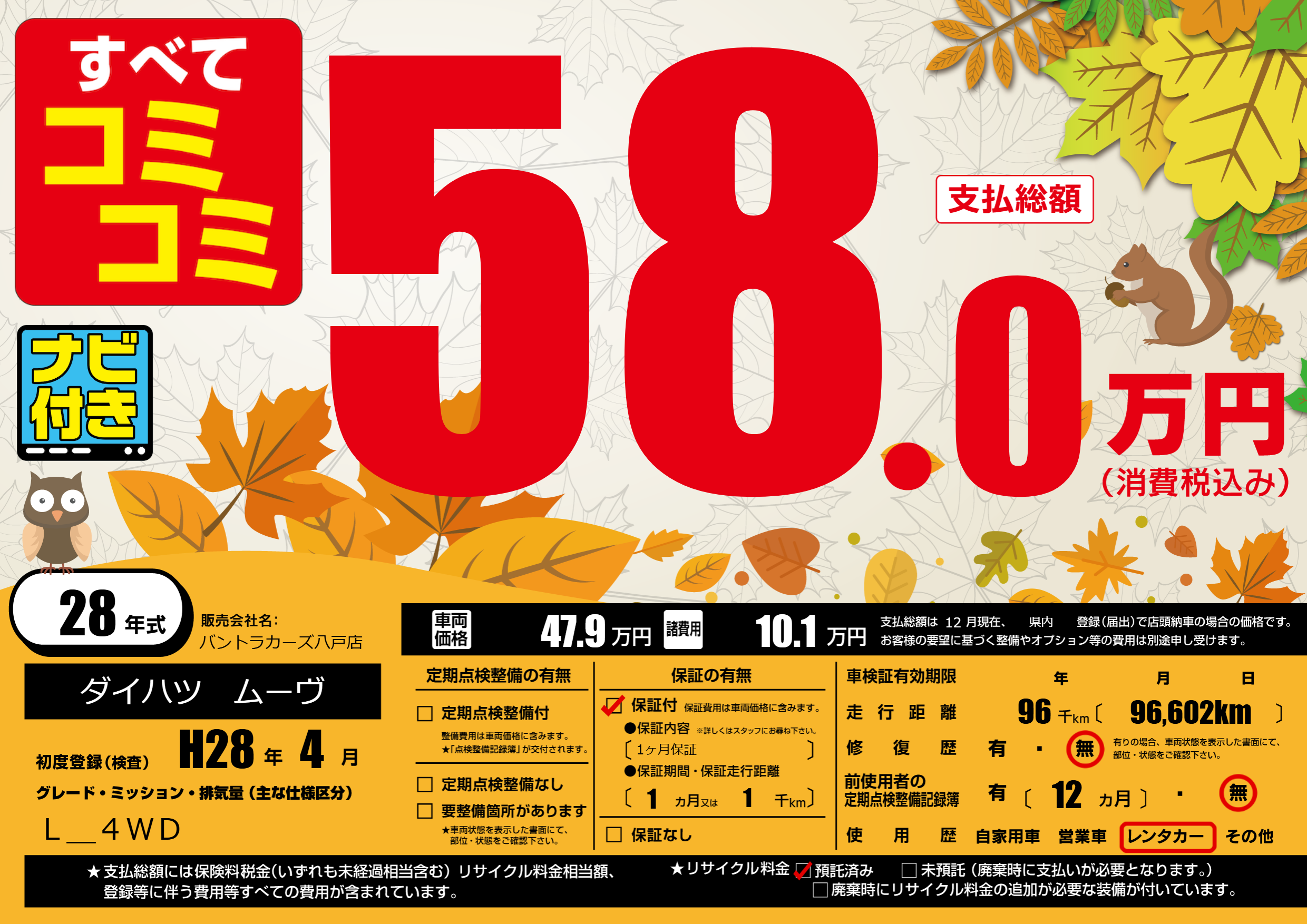 | 走行キロ | 9.6万km | 初年度登録 | H28年4月 |