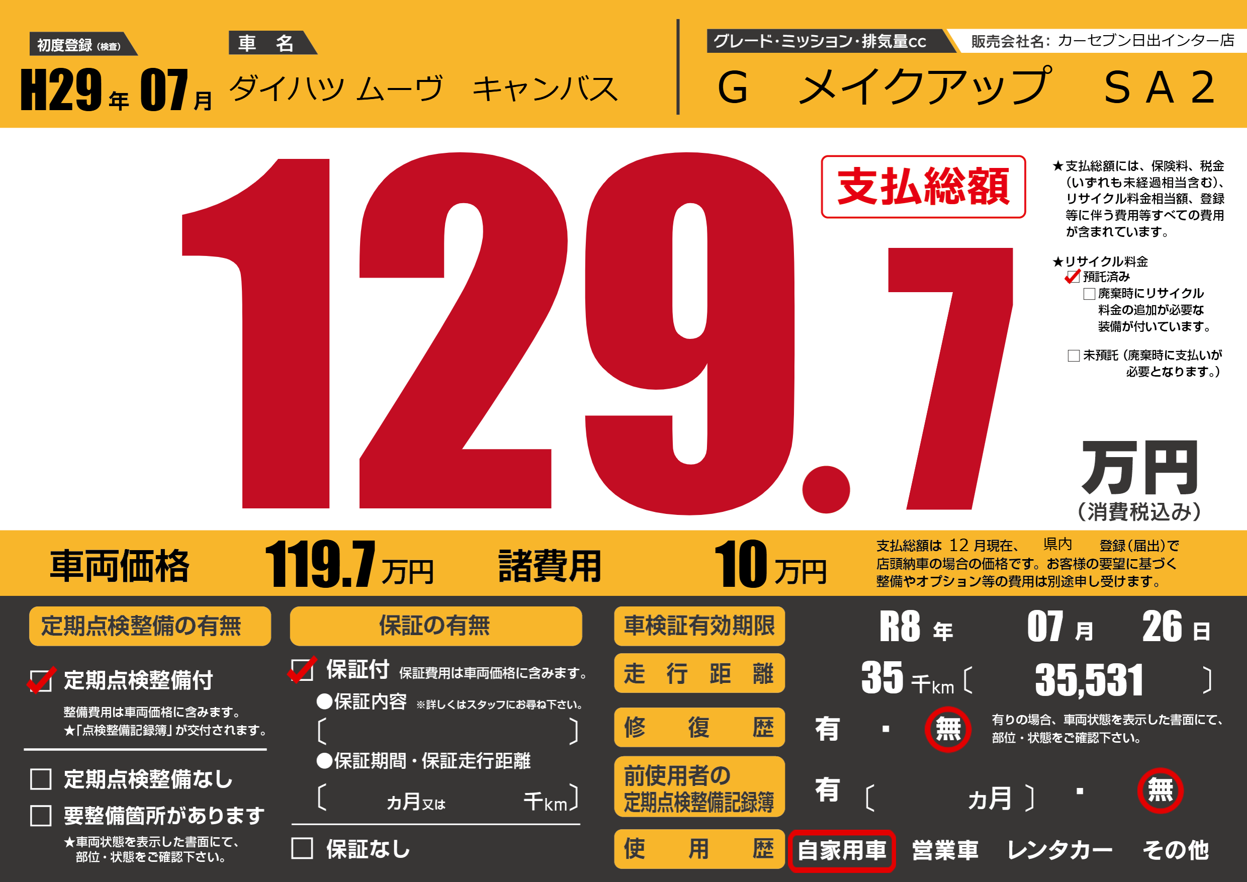 | 走行キロ | 3.5万km | 初年度登録 | H29年07月 |
