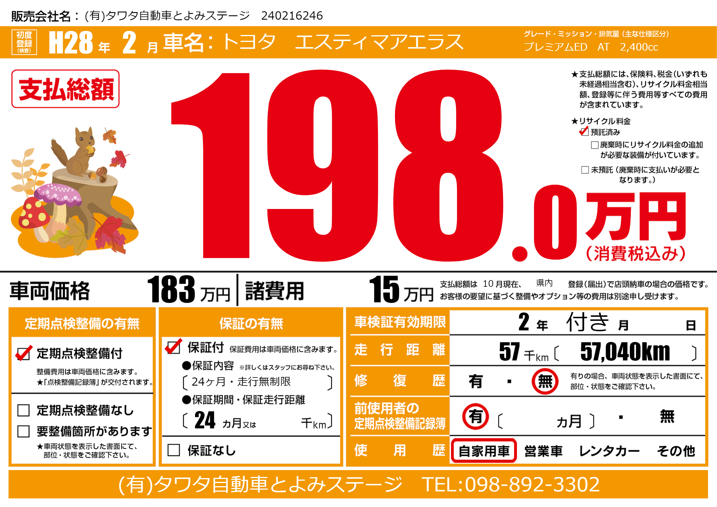 | 車名 | トヨタ エスティマアエラス | グレード ミッション 排気量 |