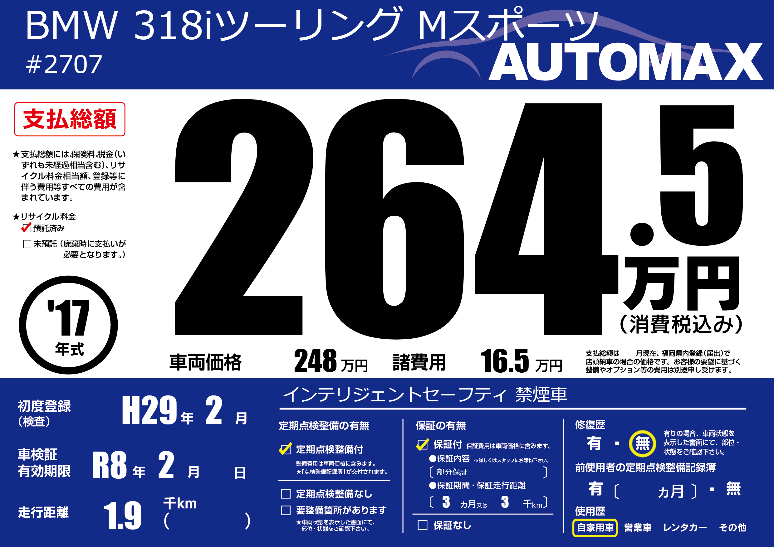 | 車名 | BMW 318iツーリング Mスポーツ | グレード ミッション 排気量 |