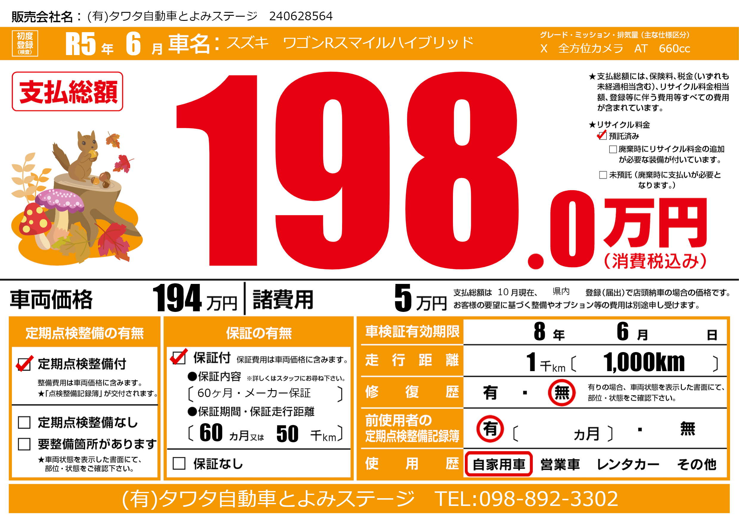 | 車名 | スズキ ワゴンRスマイルハイブリッド | グレード ミッション 排気量 |