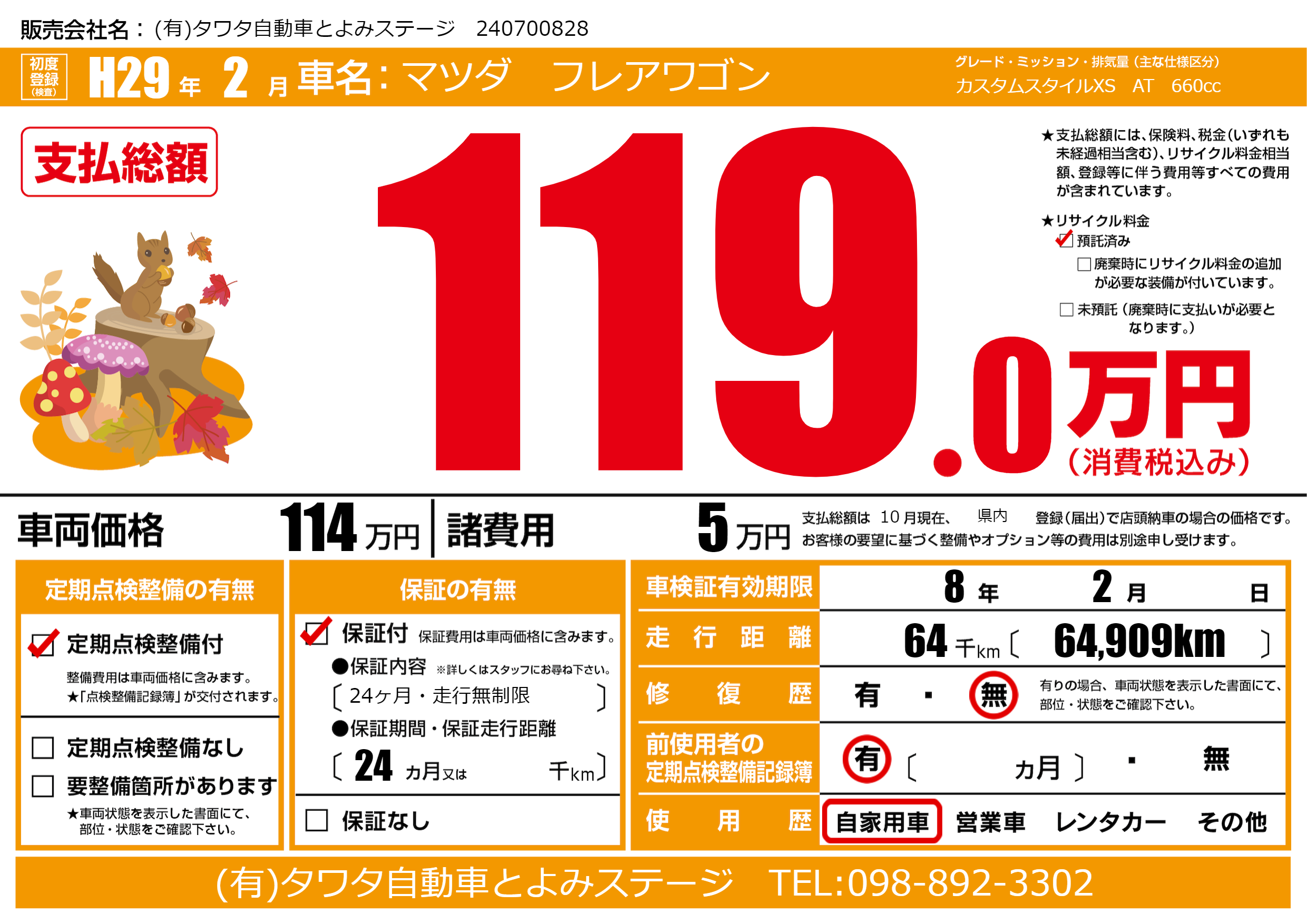 | 車名 | マツダ フレアワゴン | グレード ミッション 排気量 |