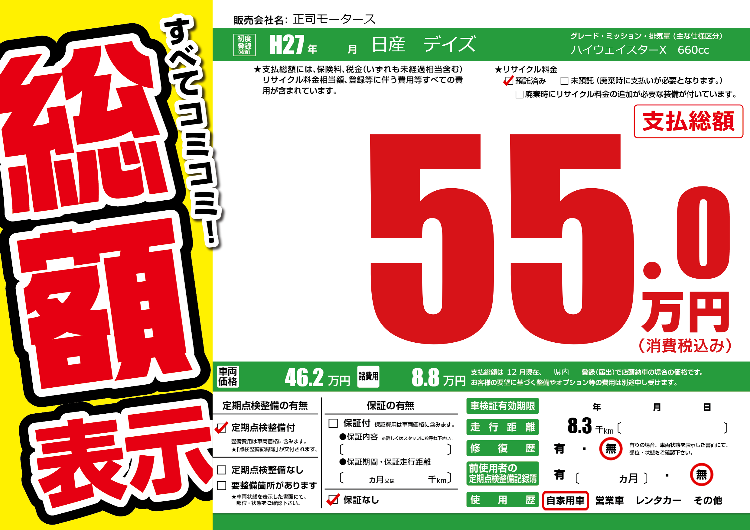 | 車名 | 日産 デイズ | グレード ミッション 排気量 |