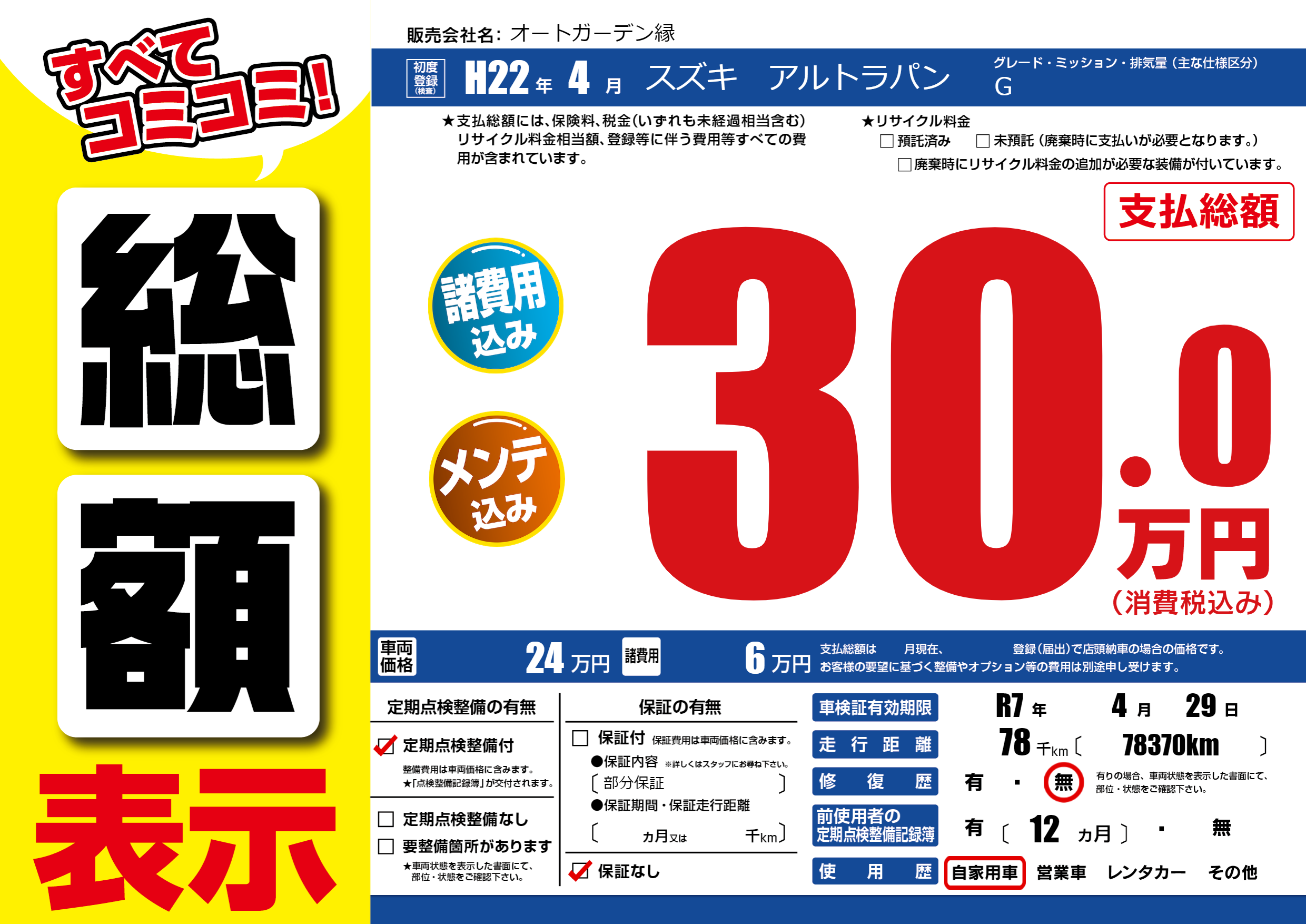 | 走行キロ | 7.8万km | 初年度登録 | H22年4月 |
