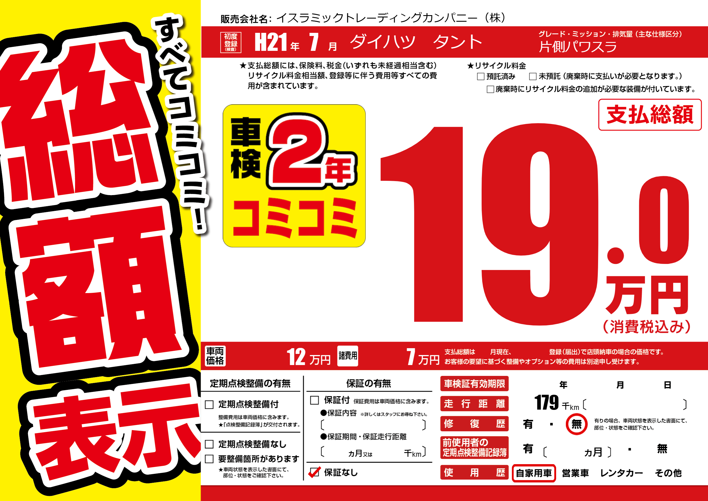 | 車名 | ダイハツ タント | グレード ミッション 排気量 |