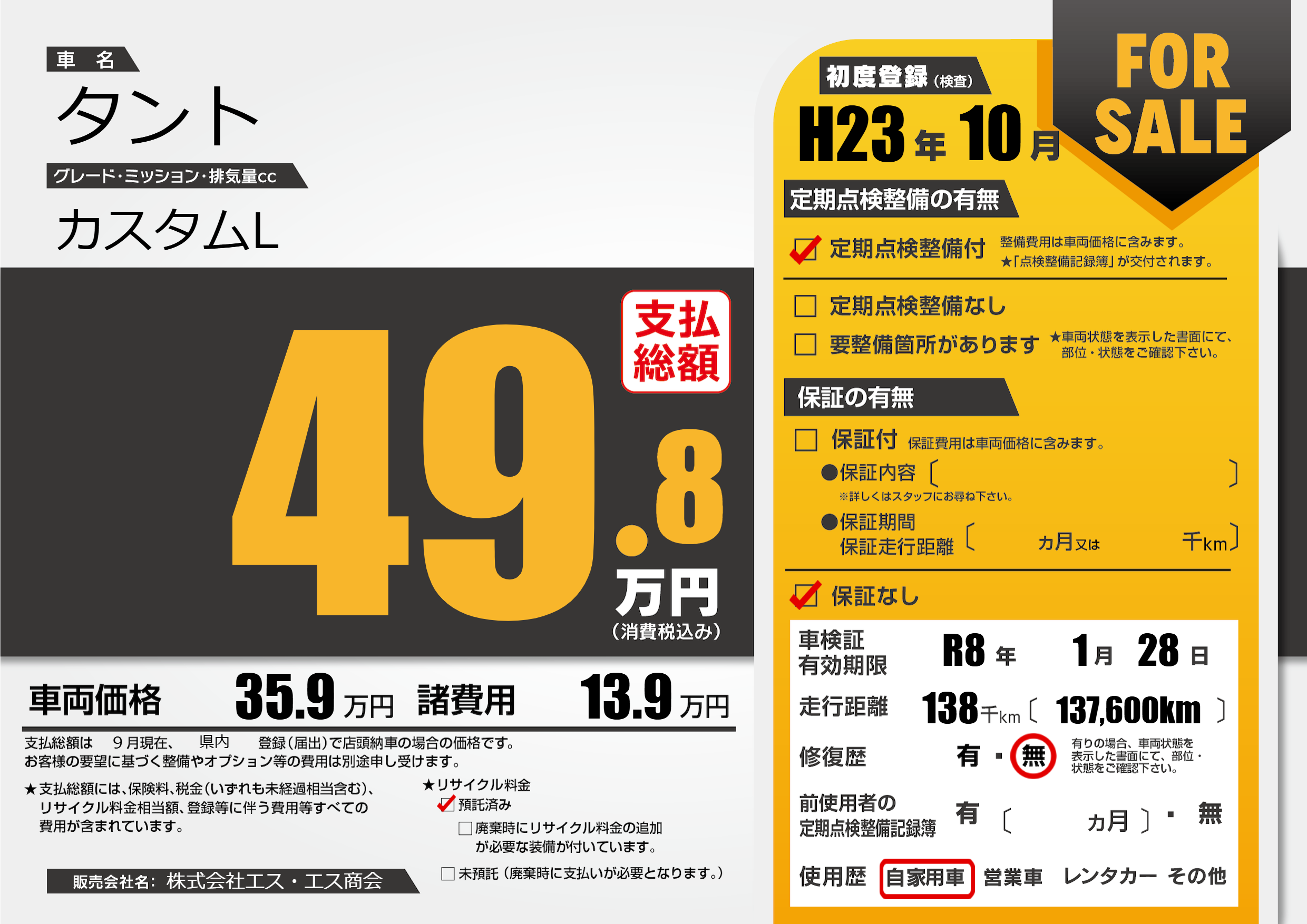 | 走行キロ | 13.8万km | 初年度登録 | H23年10月 |