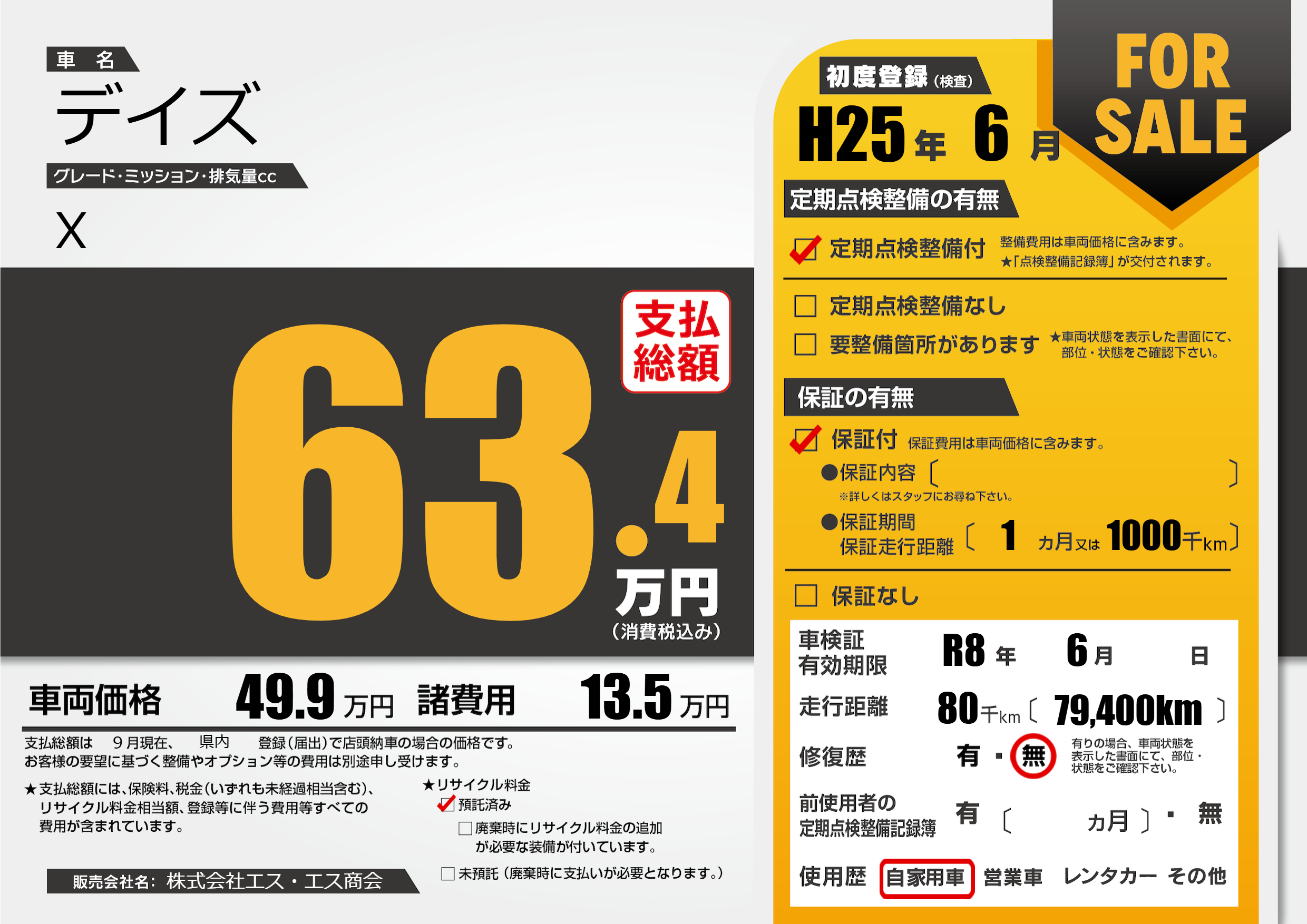 | 走行キロ | 8万km | 初年度登録 | H25年6月 |