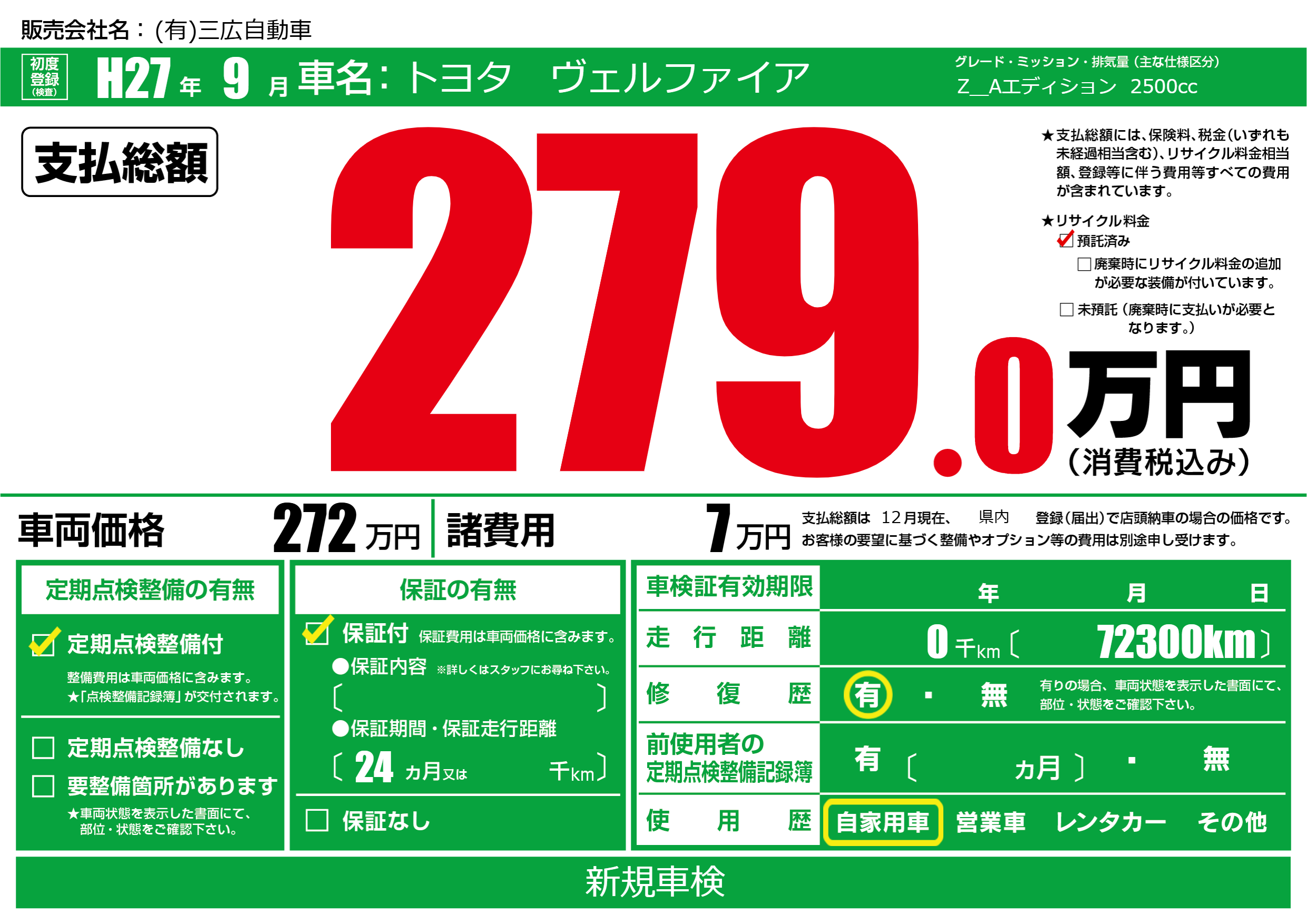 | 車名 | トヨタ ヴェルファイア | グレード ミッション 排気量 |