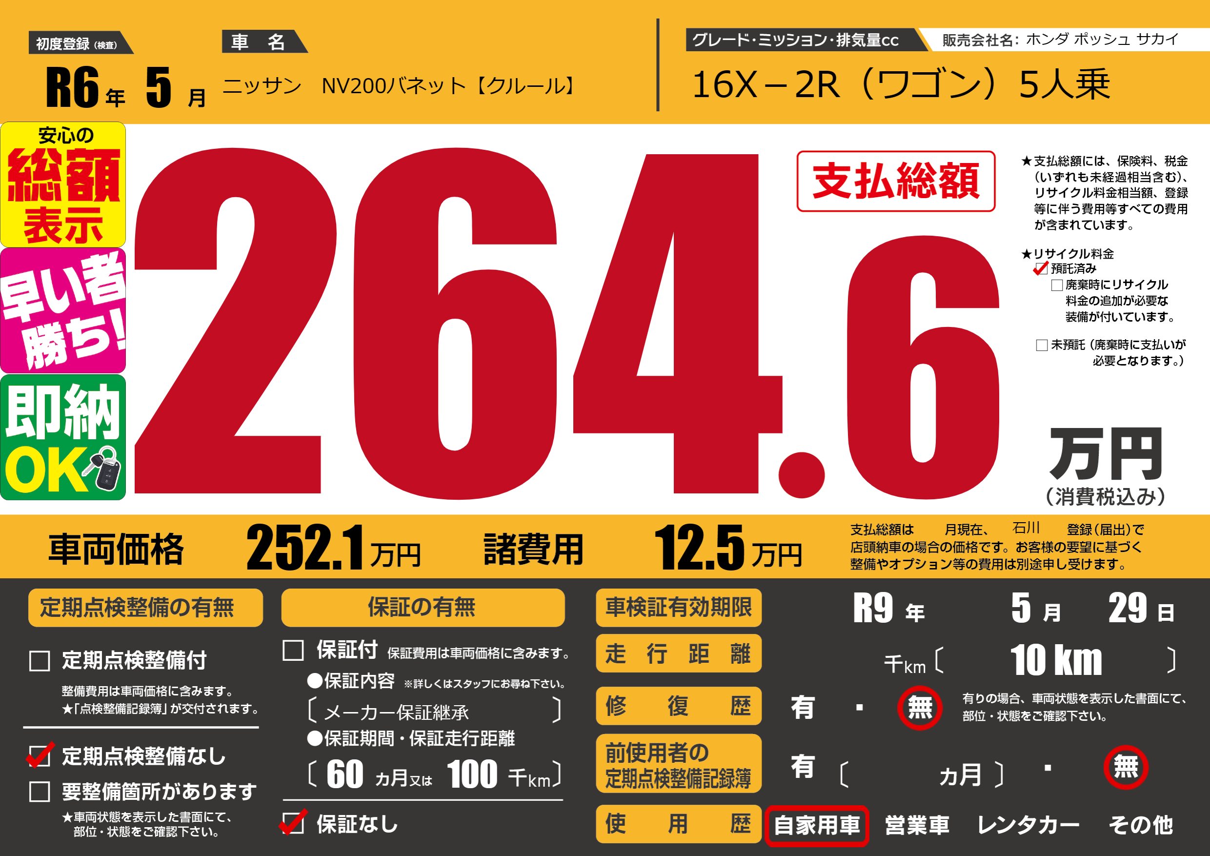 保証なし 保証内容(メーカー保証継承) 60ヶ月または(100)千kmまで |