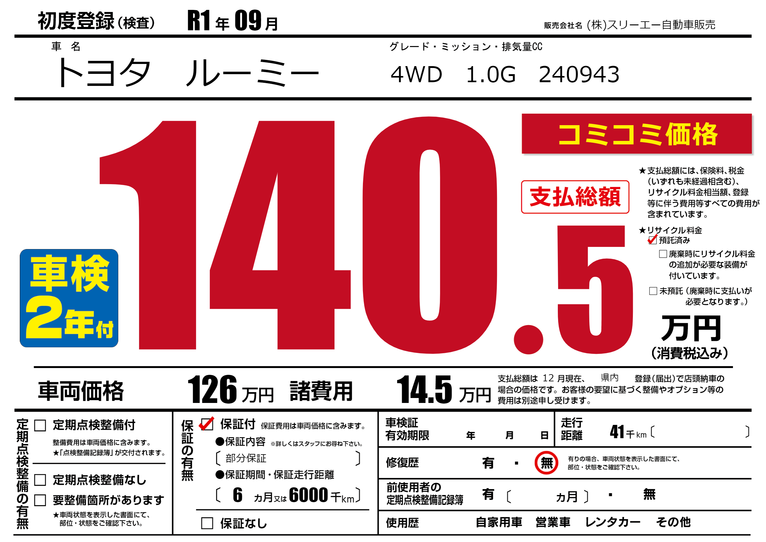 | 走行キロ | 4.1万km | 初年度登録 | R1年09月 |
