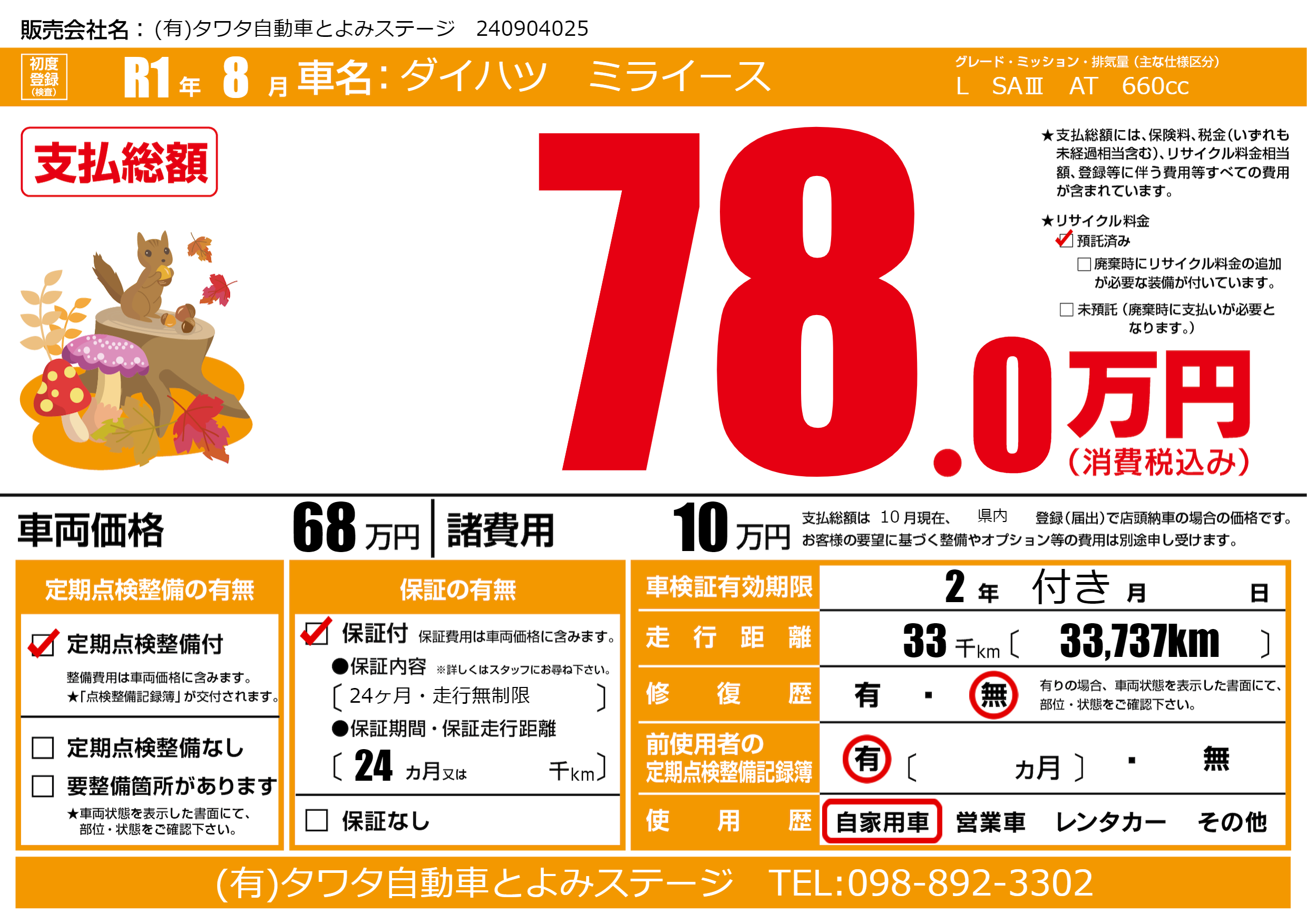 | 走行キロ | 3.3万km | 初年度登録 | R1年8月 |