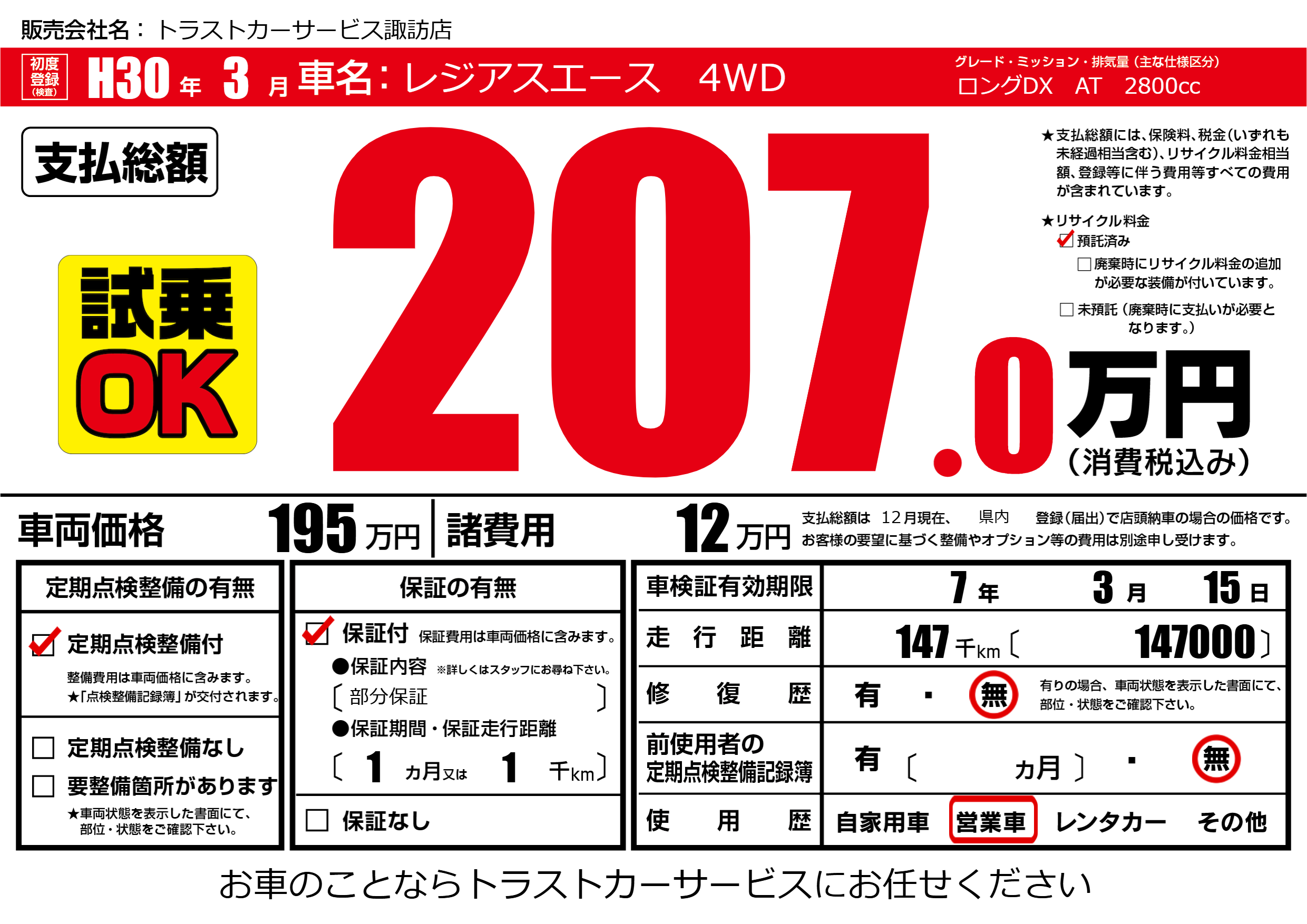 | 車名 | レジアスエース 4WD | グレード ミッション 排気量 |